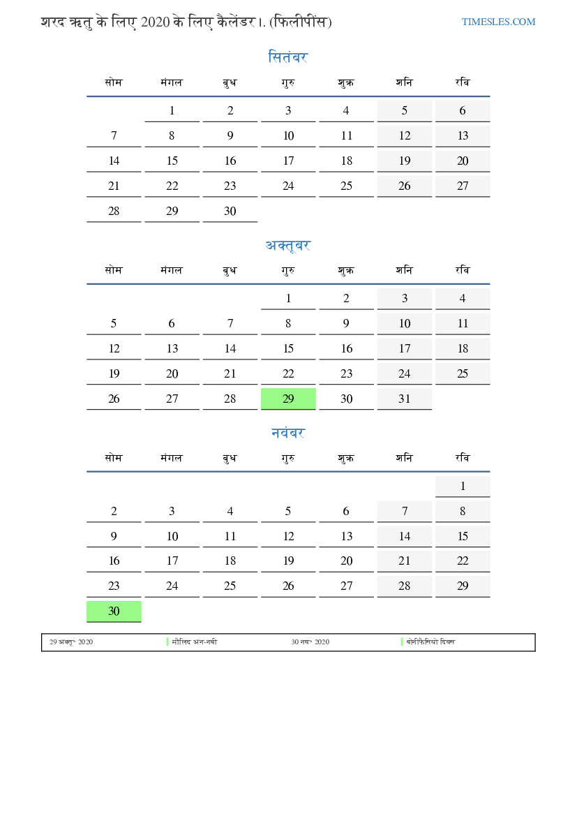 फिलीपींस के लिए 2020 की शरद ऋतु के लिए छुट्टियों और सप्ताहांत के साथ पीडीएफ कैलेंडर डाउनलोड और प्रिंट करें