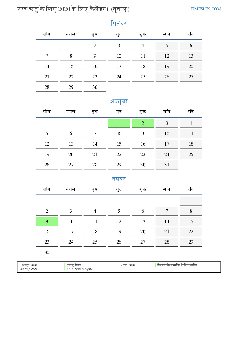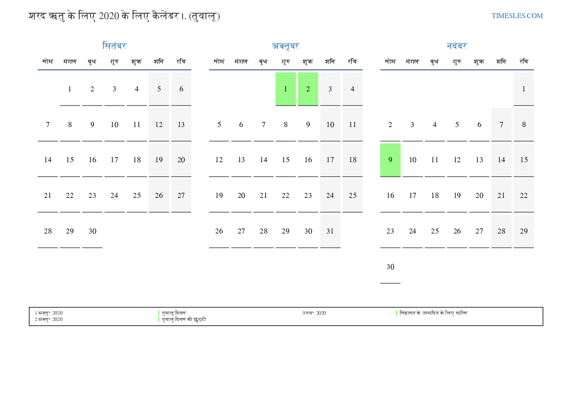 तुवालु के लिए 2020 की शरद ऋतु के लिए छुट्टियों और सप्ताहांत का कैलेंडर