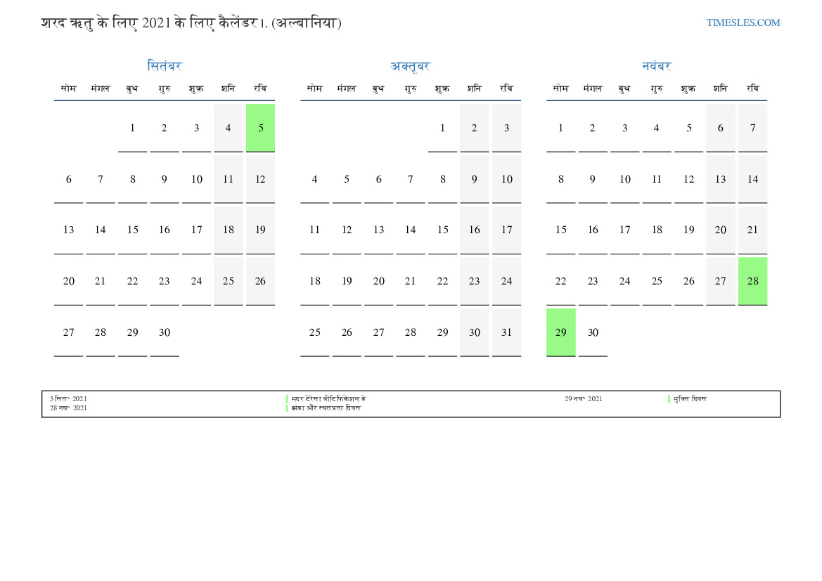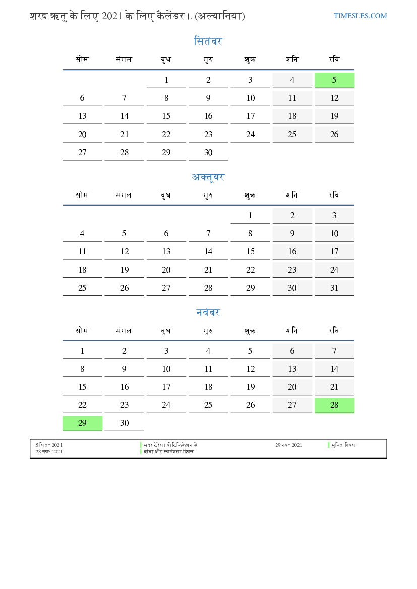 अल्बानिया के लिए 2021 की शरद ऋतु के लिए छुट्टियों और सप्ताहांत के साथ पीडीएफ कैलेंडर डाउनलोड और प्रिंट करें