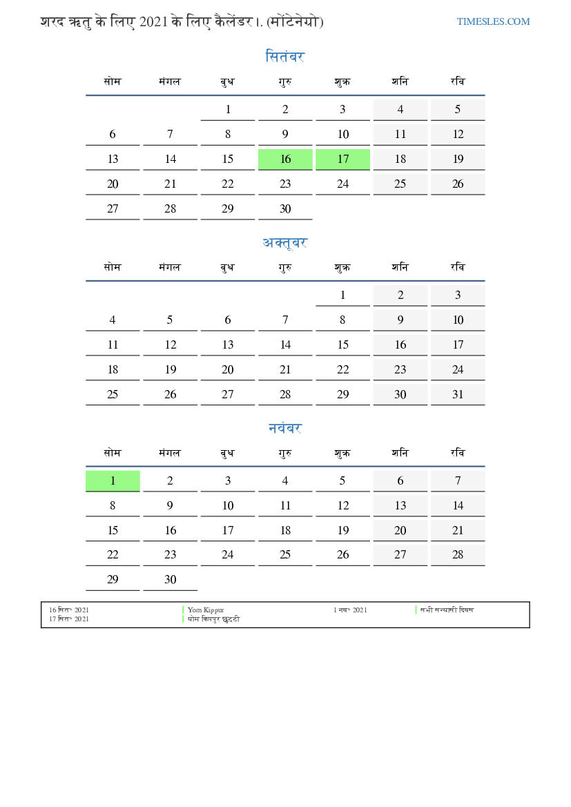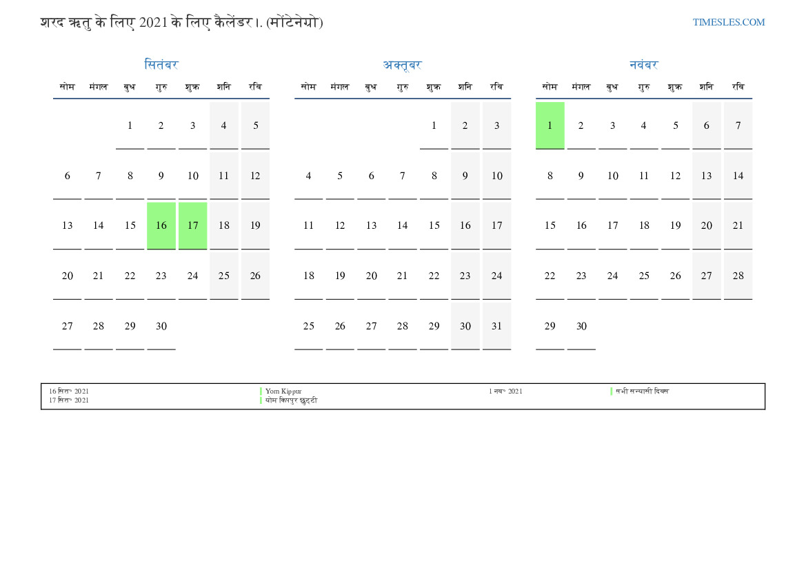 मोंटेनेग्रो के लिए 2021 की शरद ऋतु के लिए छुट्टियों और सप्ताहांत के साथ पीडीएफ कैलेंडर डाउनलोड और प्रिंट करें