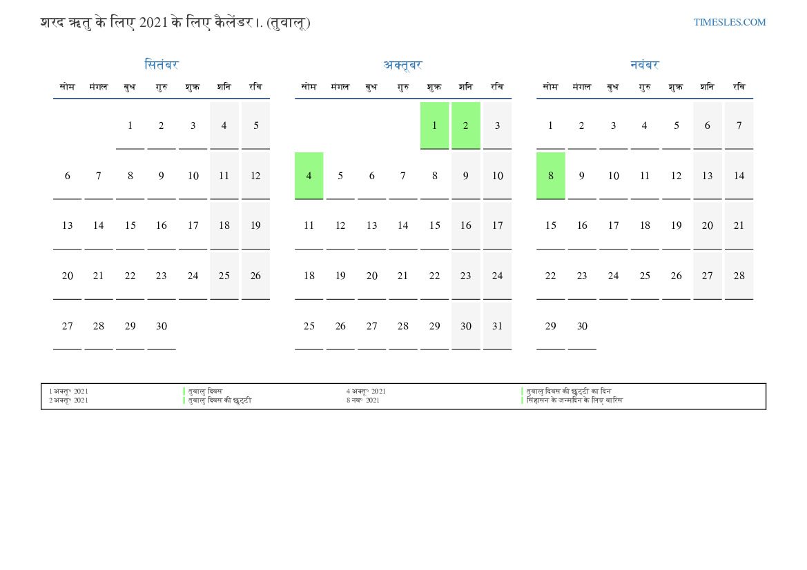 तुवालु के लिए 2021 की शरद ऋतु के लिए छुट्टियों और सप्ताहांत का कैलेंडर