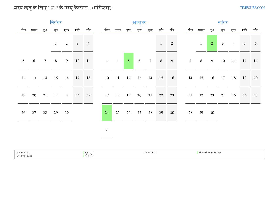 शरद ऋतु के लिए कैलेंडर 2022 मॉरीशस के लिए