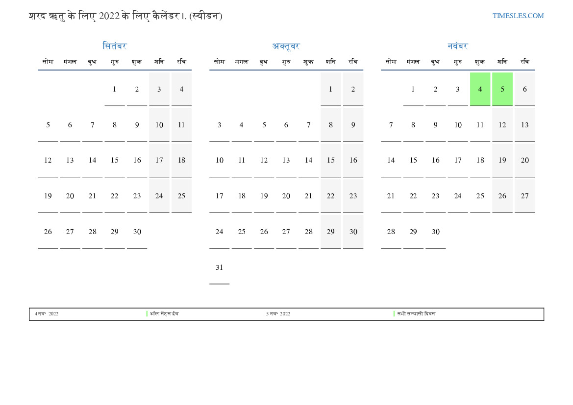 शरद ऋतु के लिए कैलेंडर 2022 स्वीडन के लिए