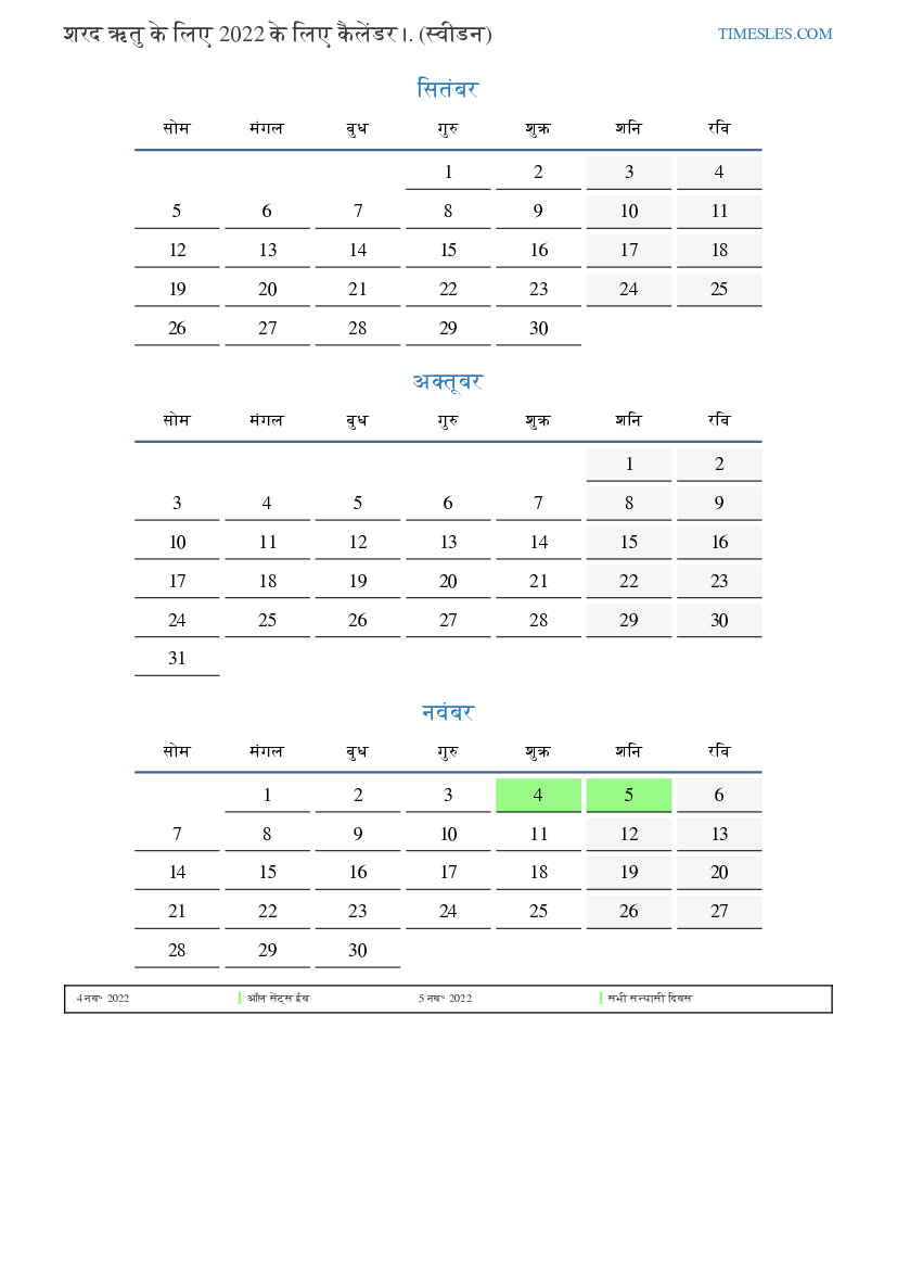 स्वीडन के लिए 2022 की शरद ऋतु के लिए छुट्टियों और सप्ताहांत का कैलेंडर