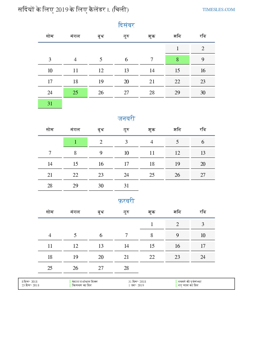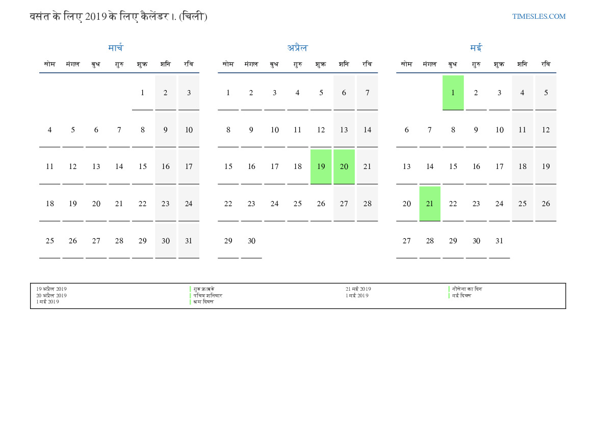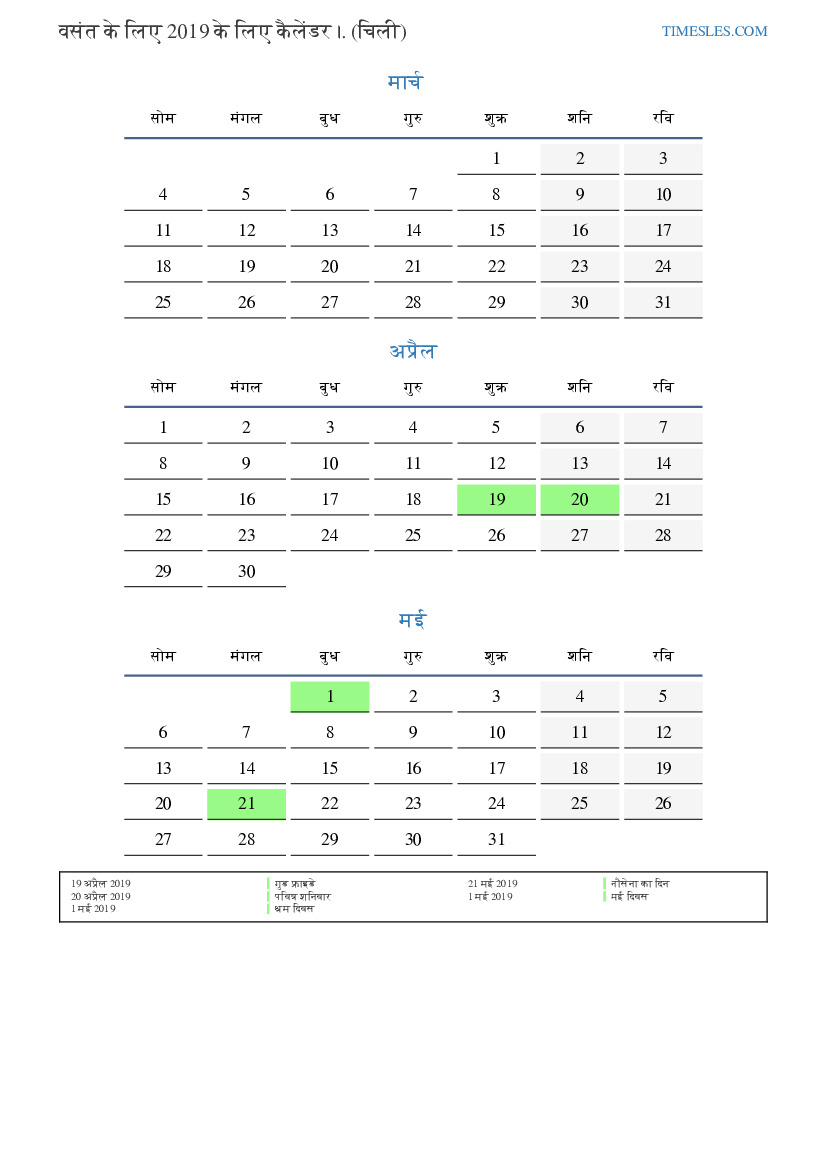 वसंत के लिए कैलेंडर 2019 चिली के लिए