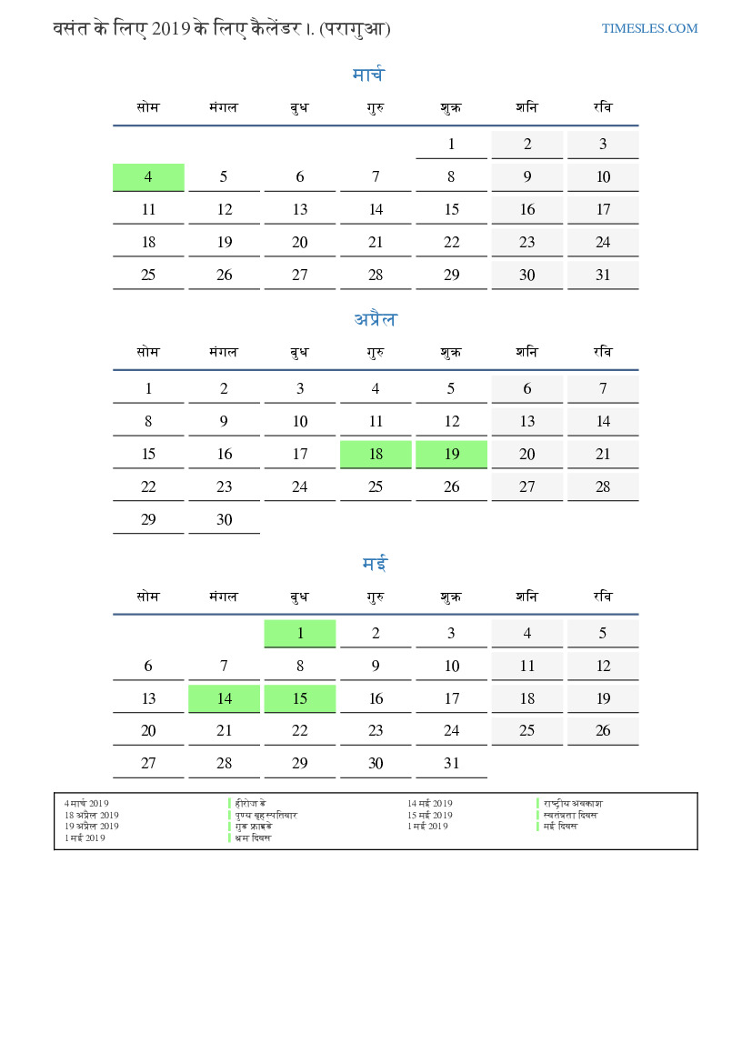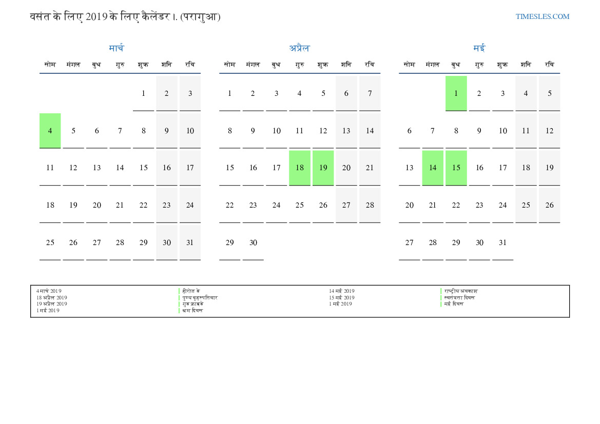 वसंत के लिए कैलेंडर 2019 पराग्वे के लिए