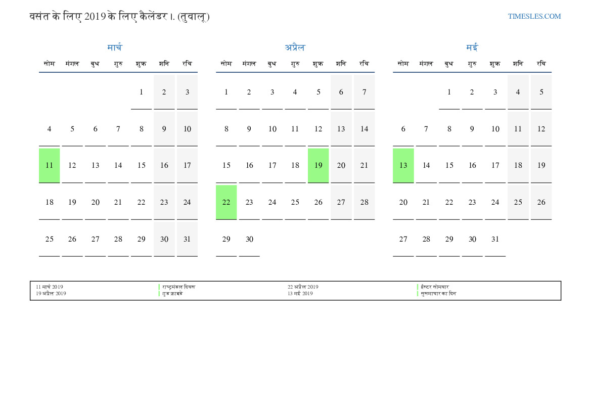 तुवालु के लिए 2019 की वसंत के लिए छुट्टियों और सप्ताहांत का कैलेंडर