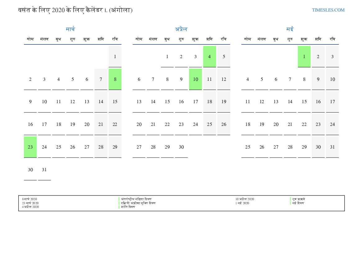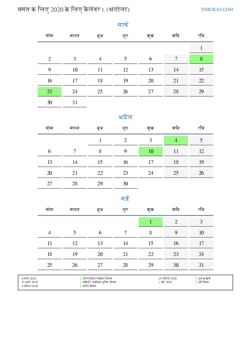 अंगोला के लिए 2020 की वसंत के लिए छुट्टियों और सप्ताहांत के साथ पीडीएफ कैलेंडर डाउनलोड और प्रिंट करें