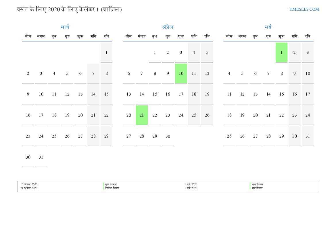 ब्राजील के लिए 2020 की वसंत के लिए छुट्टियों और सप्ताहांत का कैलेंडर