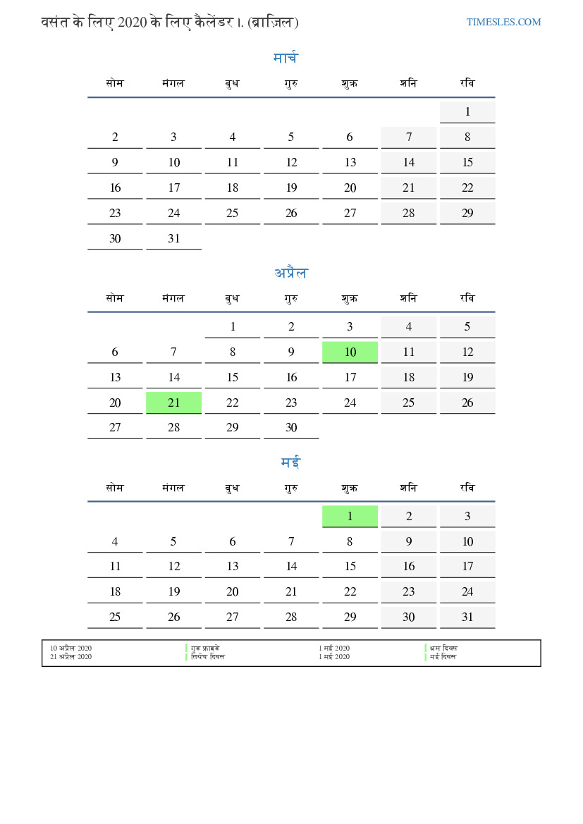 ब्राजील के लिए 2020 की वसंत के लिए छुट्टियों और सप्ताहांत के साथ पीडीएफ कैलेंडर डाउनलोड और प्रिंट करें