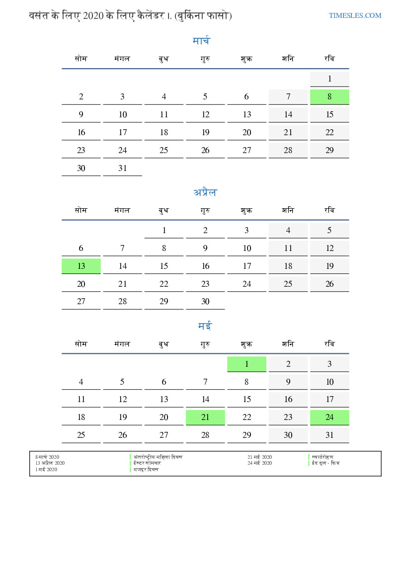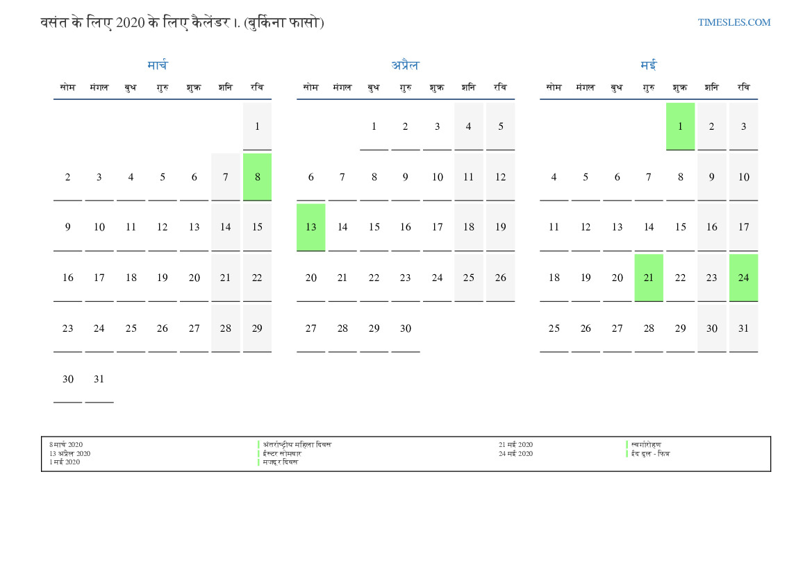 वसंत के लिए कैलेंडर 2020 बुर्किना फासो के लिए