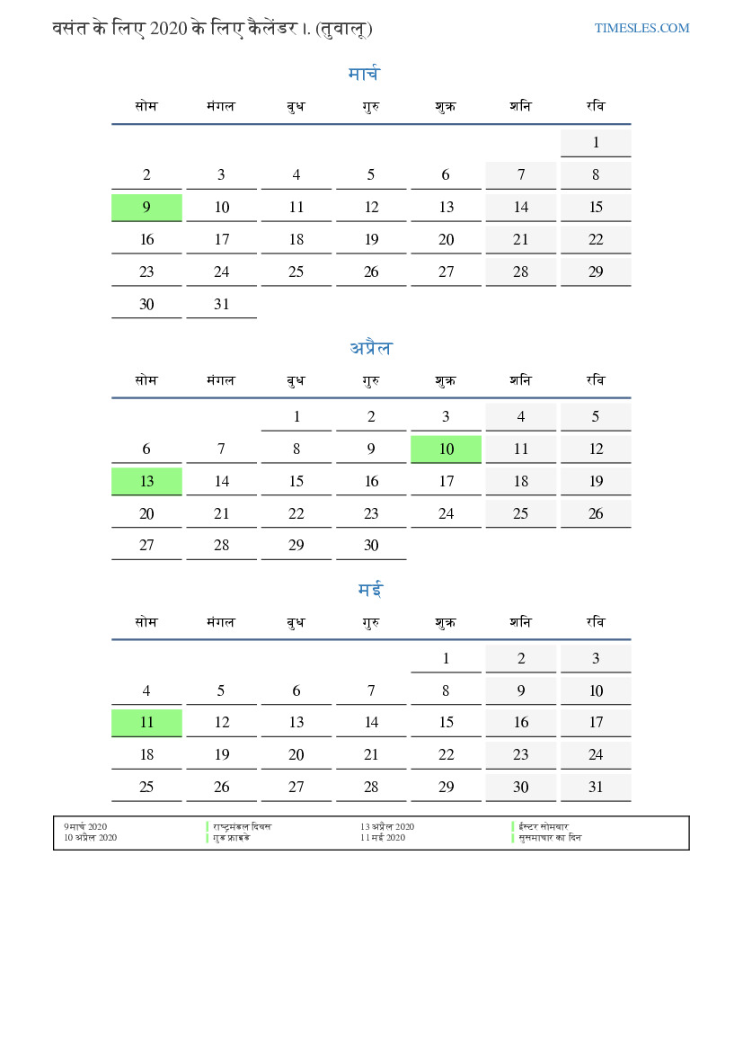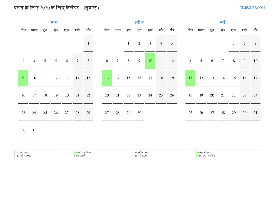 तुवालु के लिए 2020 की वसंत के लिए छुट्टियों और सप्ताहांत का कैलेंडर