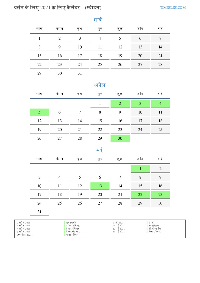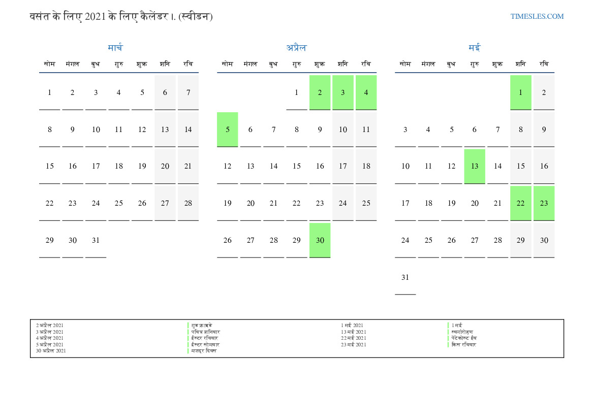 वसंत के लिए कैलेंडर 2021 स्वीडन के लिए