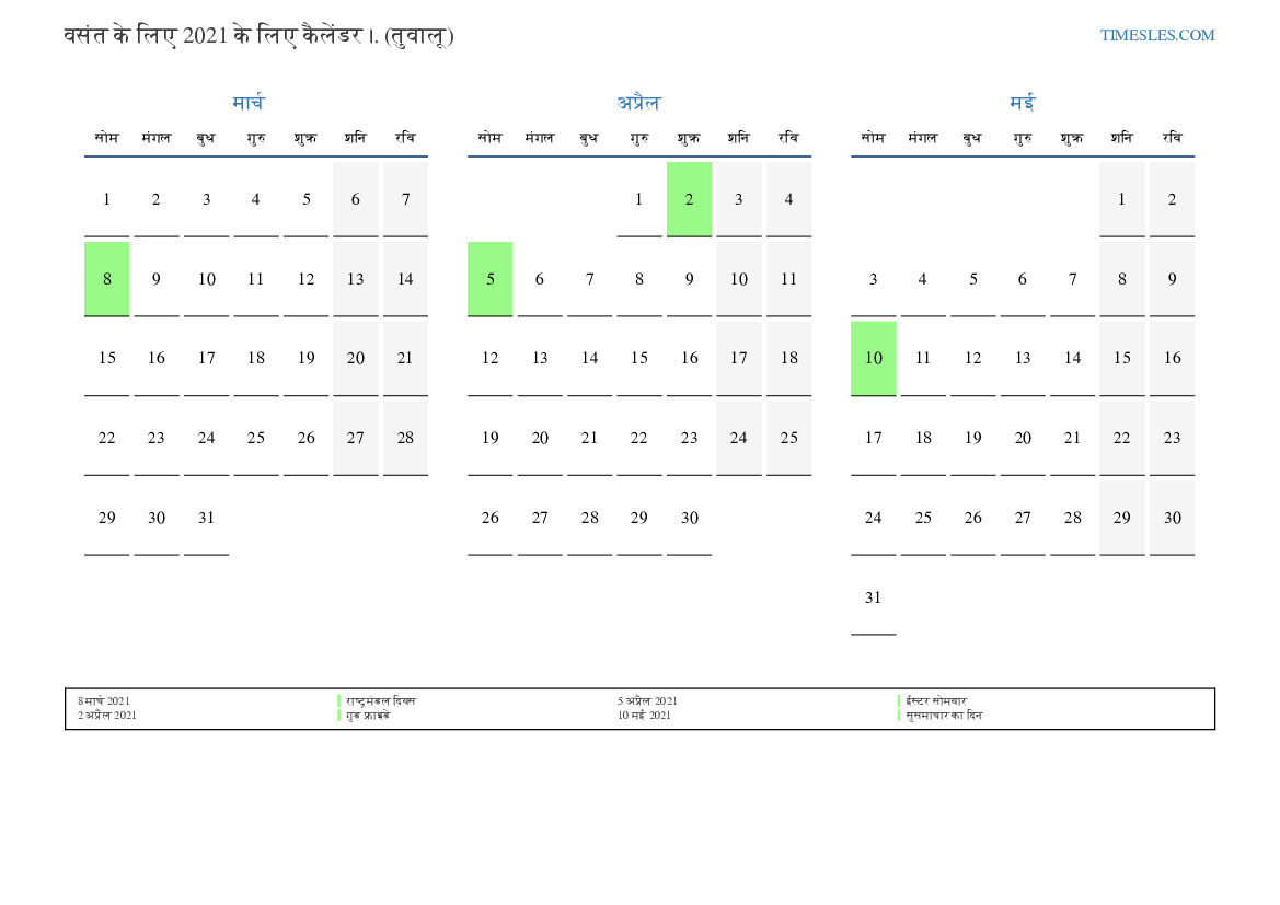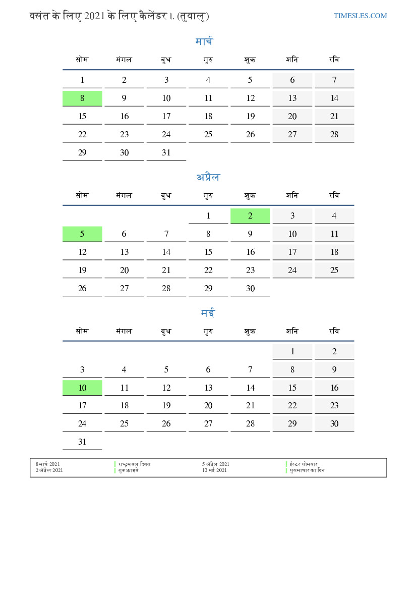 तुवालु के लिए 2021 की वसंत के लिए छुट्टियों और सप्ताहांत का कैलेंडर
