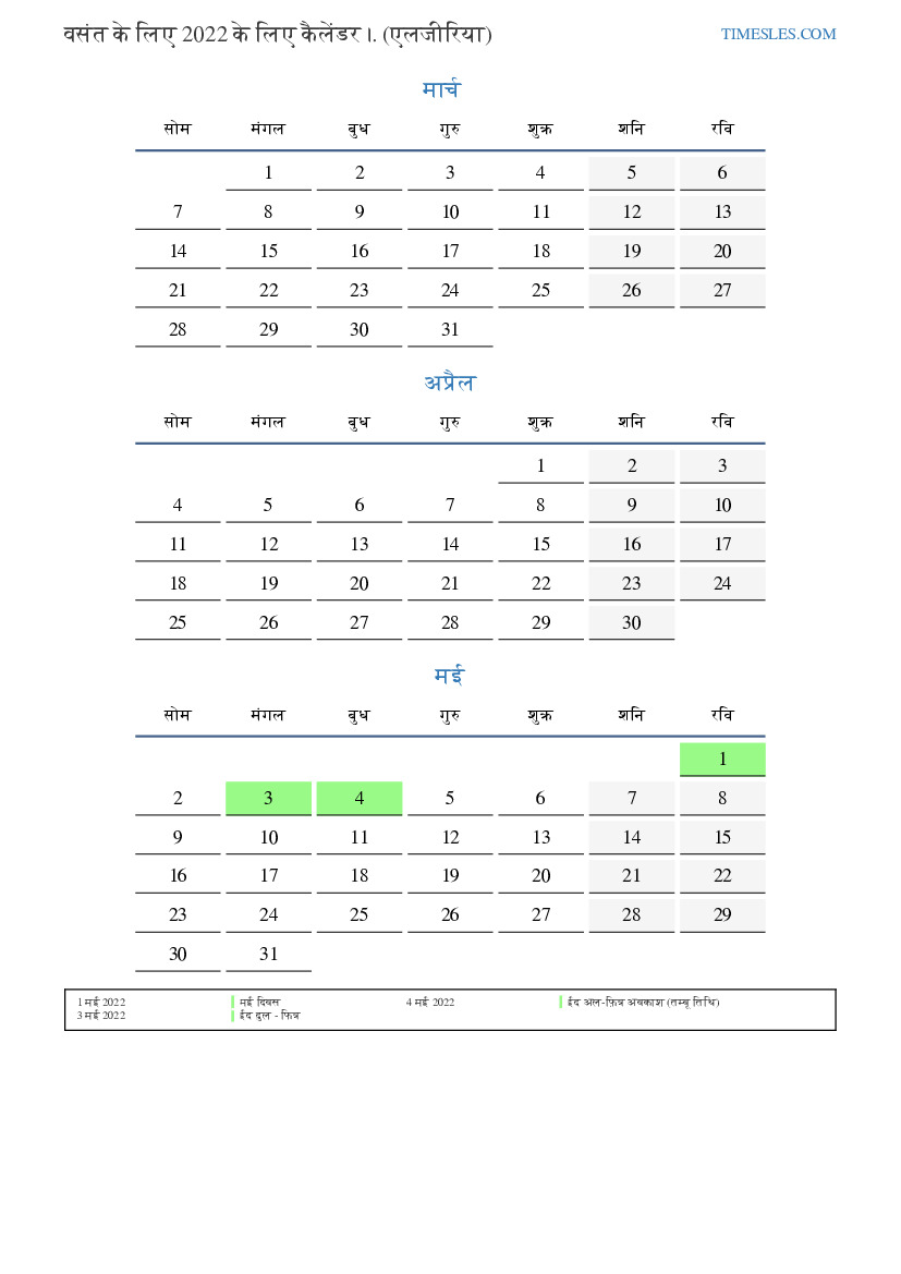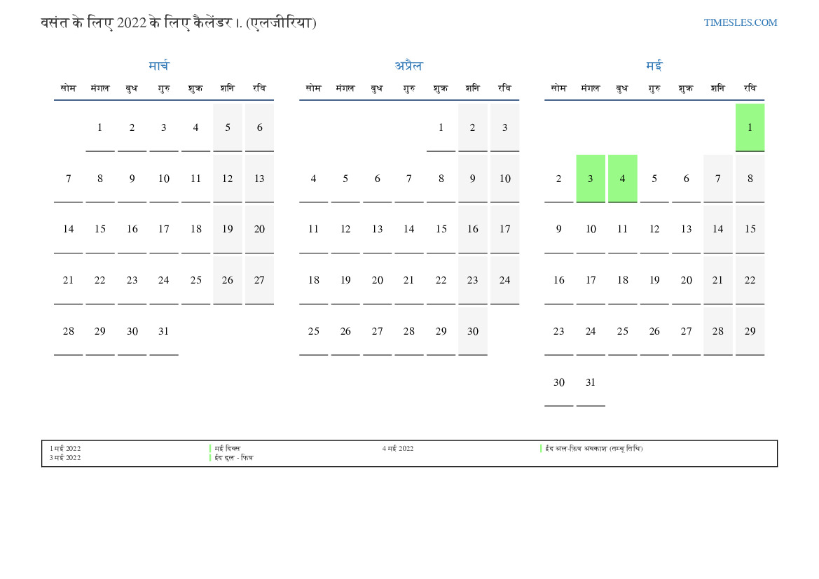 वसंत के लिए कैलेंडर 2022 अल्जीरिया के लिए