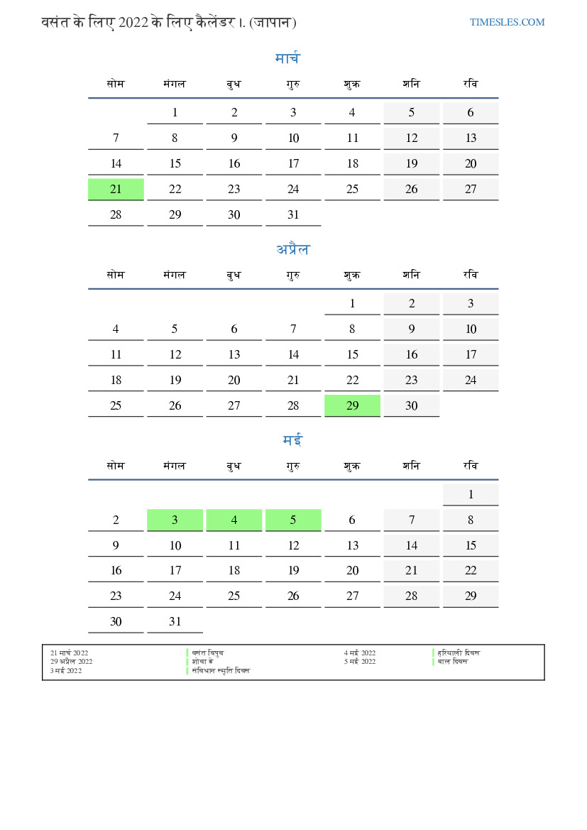 जापान के लिए 2022 की वसंत के लिए छुट्टियों और सप्ताहांत के साथ पीडीएफ कैलेंडर डाउनलोड और प्रिंट करें