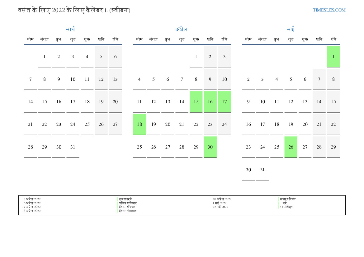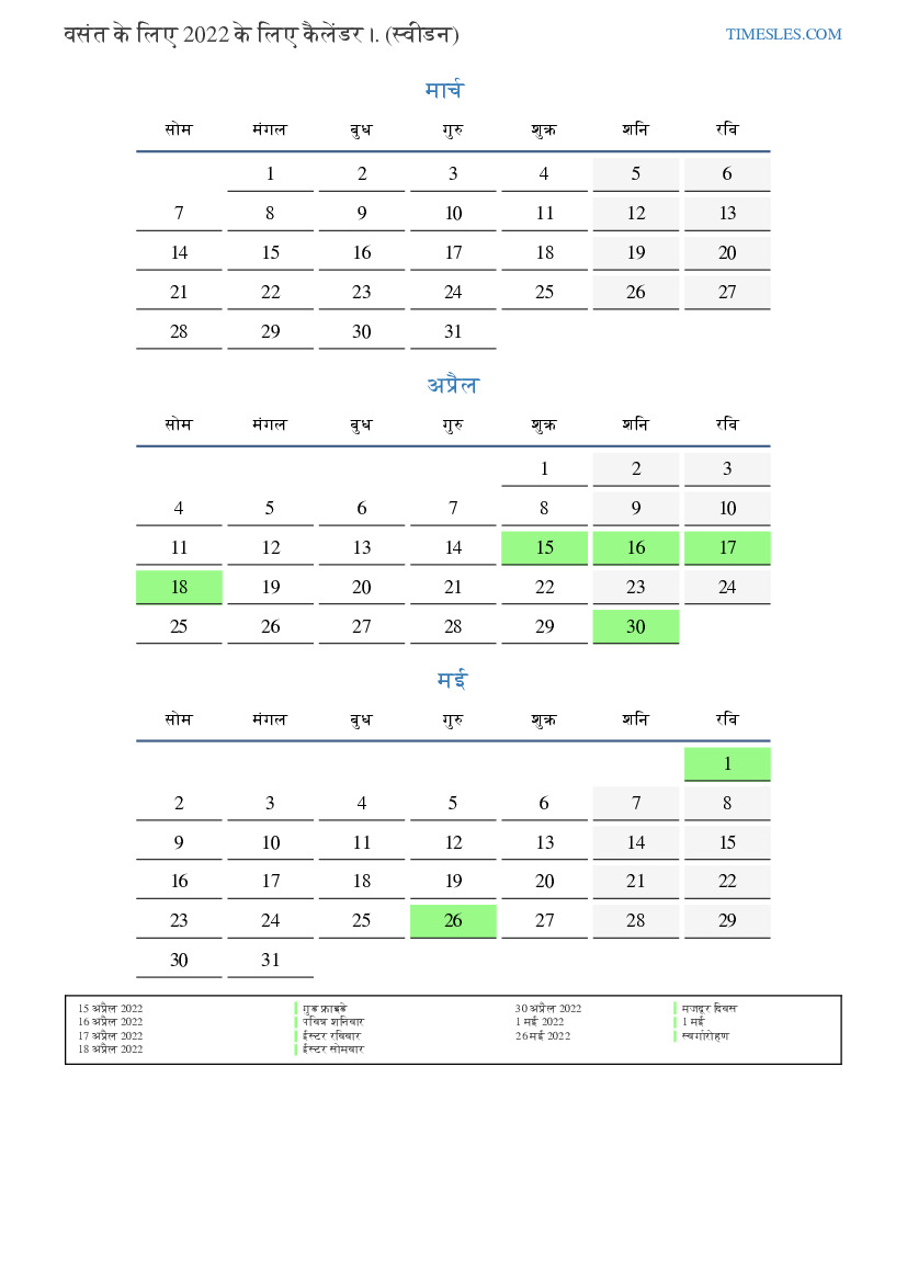 वसंत के लिए कैलेंडर 2022 स्वीडन के लिए