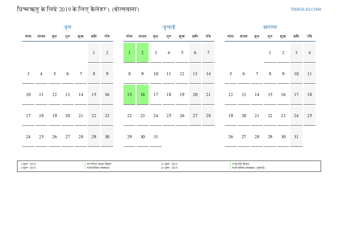 ग्रिष्मऋतु के लिये कैलेंडर 2019 बोत्सवाना के लिए