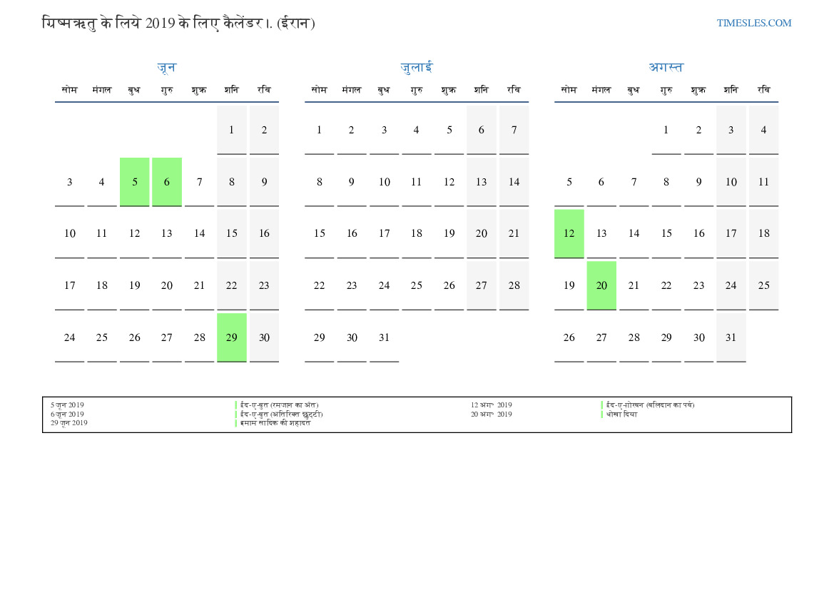 ग्रिष्मऋतु के लिये कैलेंडर 2019 ईरान के लिए