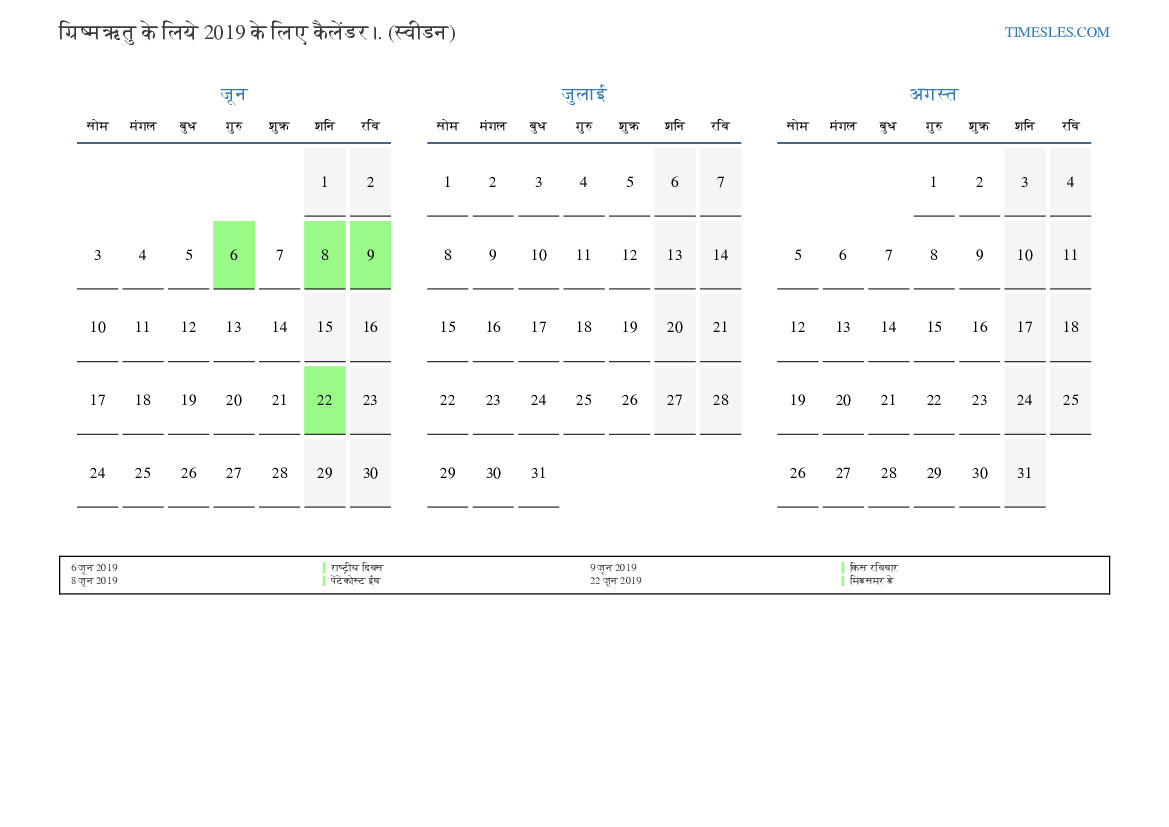 ग्रिष्मऋतु के लिये कैलेंडर 2019 स्वीडन के लिए