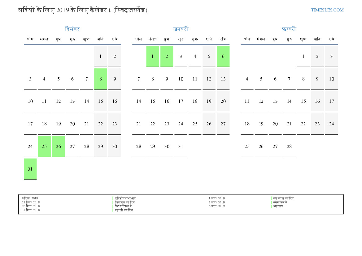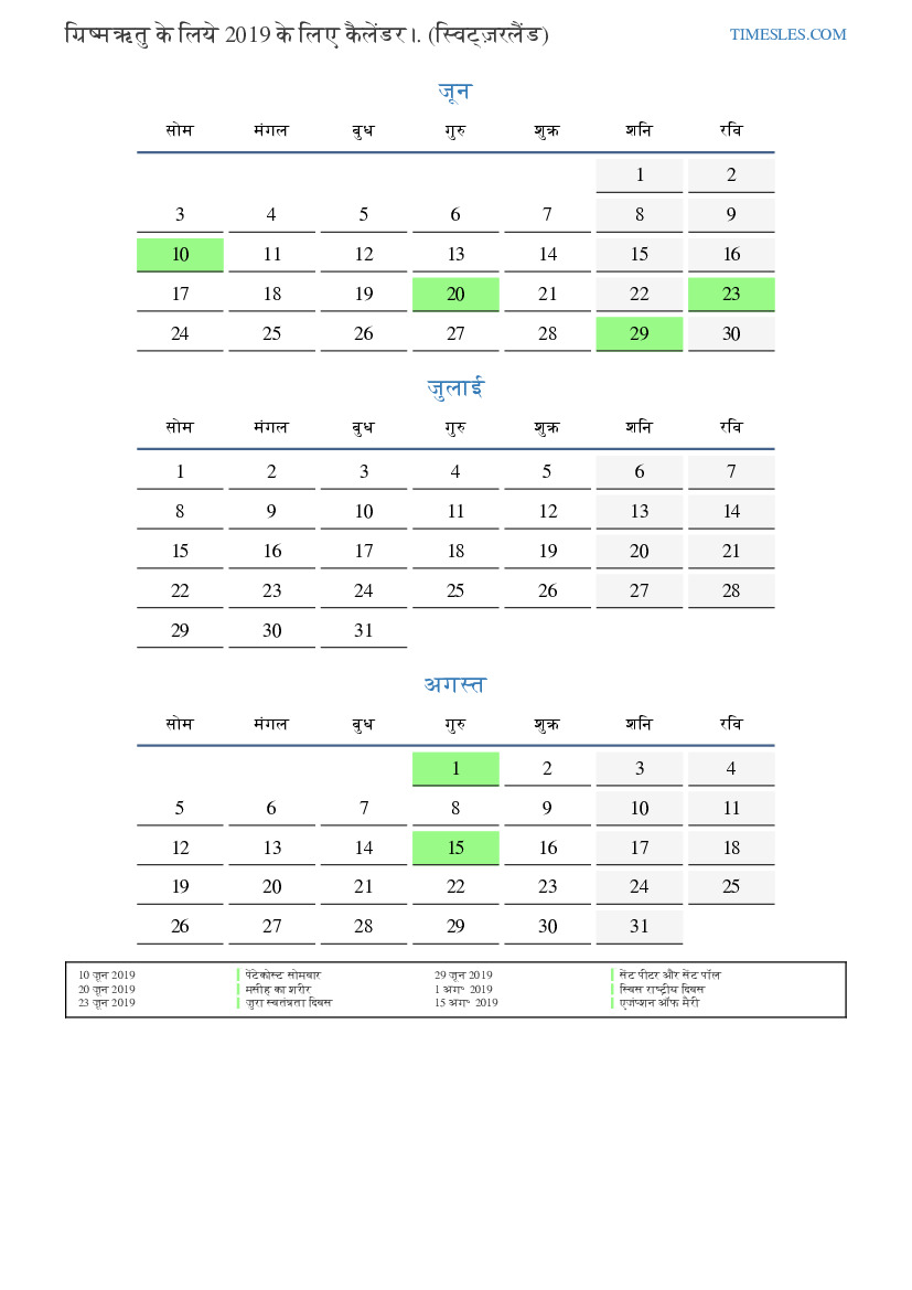 स्विट्जरलैंड के लिए 2019 की ग्रिष्मऋतु के लिये छुट्टियों और सप्ताहांत का कैलेंडर