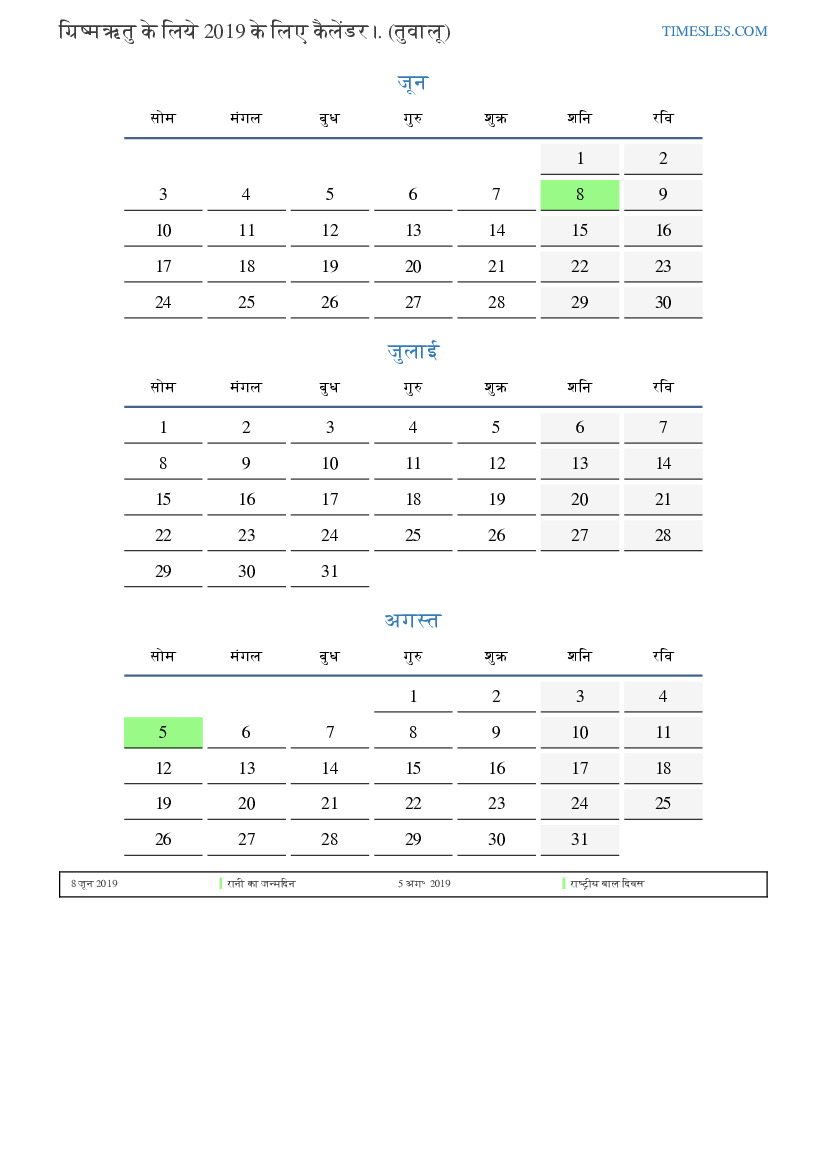 तुवालु के लिए 2019 की ग्रिष्मऋतु के लिये छुट्टियों और सप्ताहांत के साथ पीडीएफ कैलेंडर डाउनलोड और प्रिंट करें