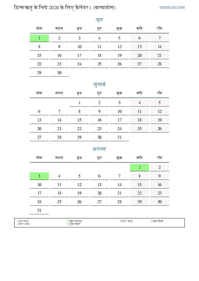 ग्रिष्मऋतु के लिये कैलेंडर 2020 बारबाडोस के लिए