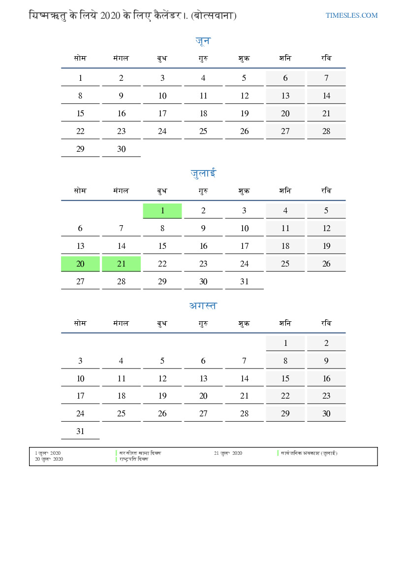 ग्रिष्मऋतु के लिये कैलेंडर 2020 बोत्सवाना के लिए