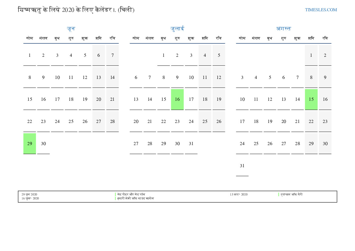 ग्रिष्मऋतु के लिये कैलेंडर 2020 चिली के लिए