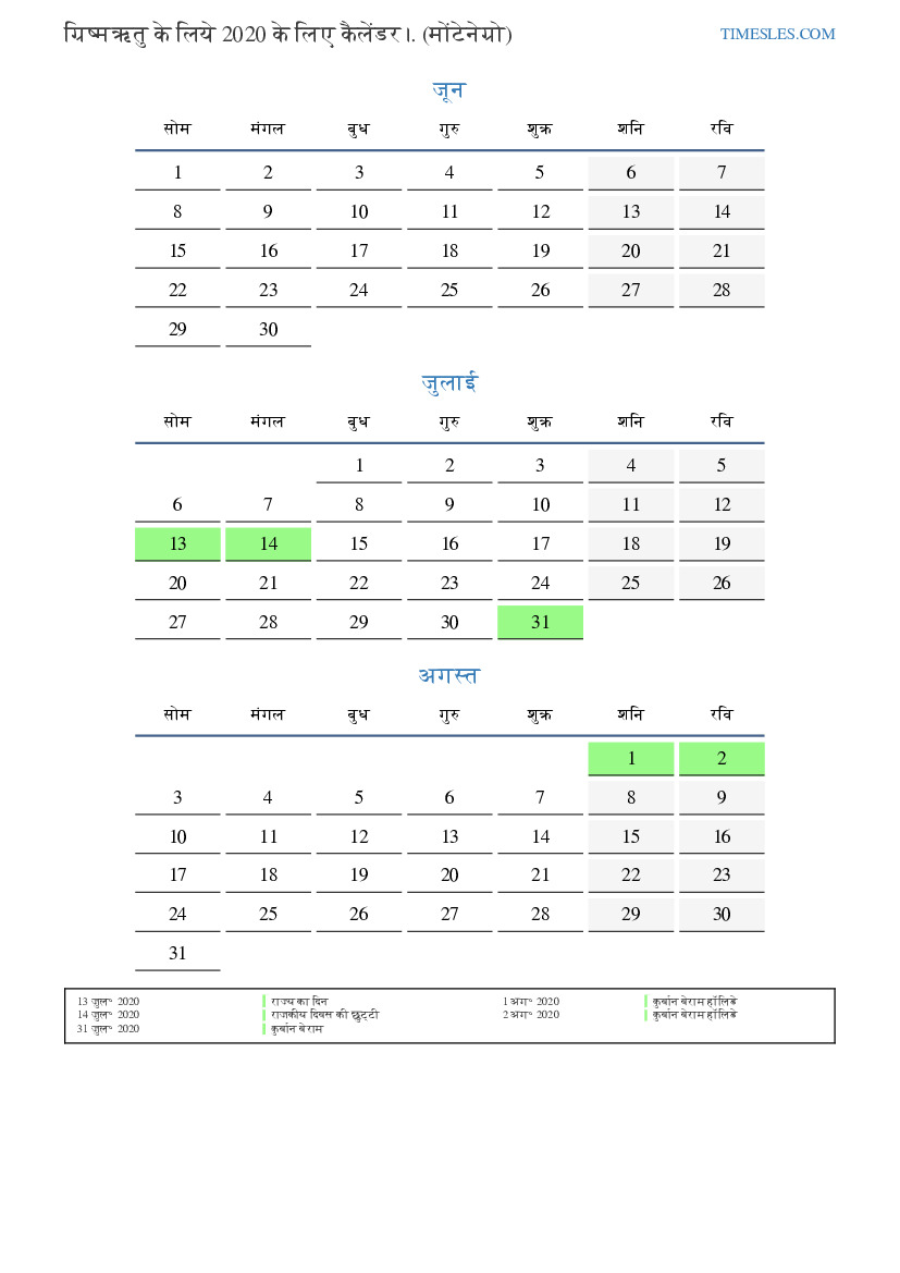 ग्रिष्मऋतु के लिये कैलेंडर 2020 मोंटेनेग्रो के लिए