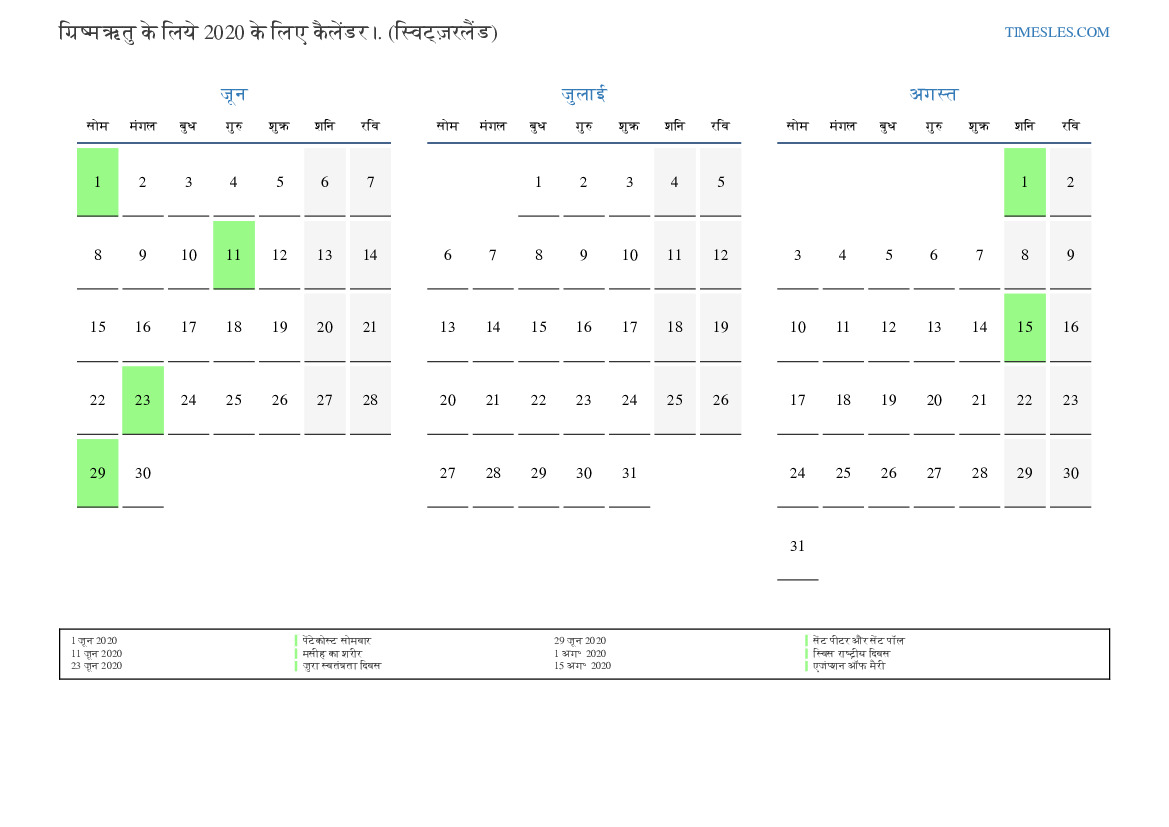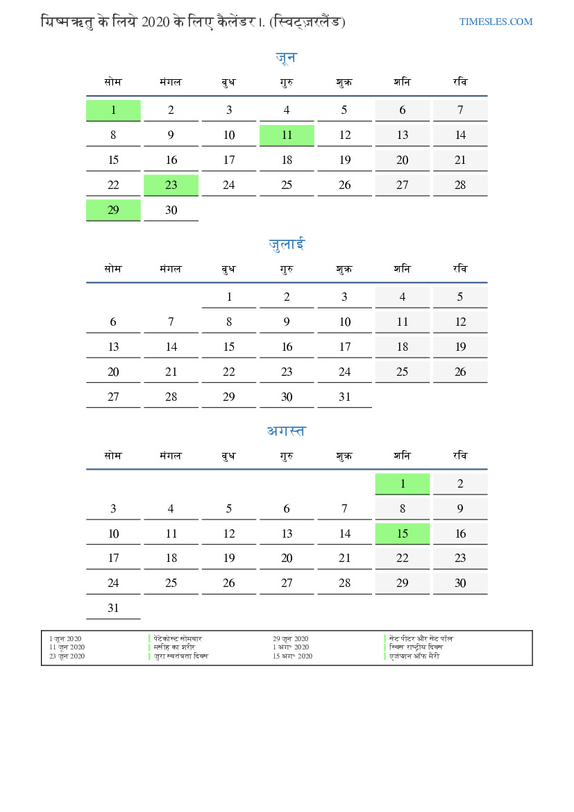 ग्रिष्मऋतु के लिये कैलेंडर 2020 स्विट्जरलैंड के लिए