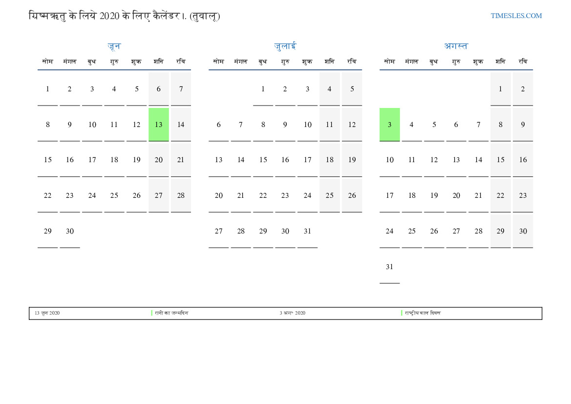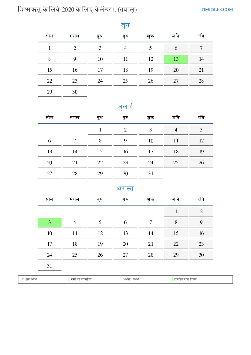 तुवालु के लिए 2020 की ग्रिष्मऋतु के लिये छुट्टियों और सप्ताहांत के साथ पीडीएफ कैलेंडर डाउनलोड और प्रिंट करें