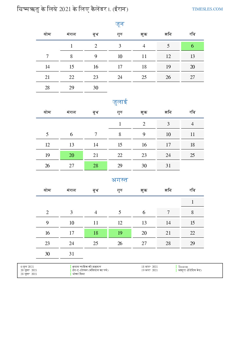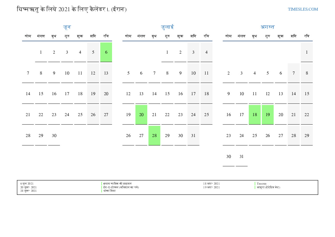 ग्रिष्मऋतु के लिये कैलेंडर 2021 ईरान के लिए