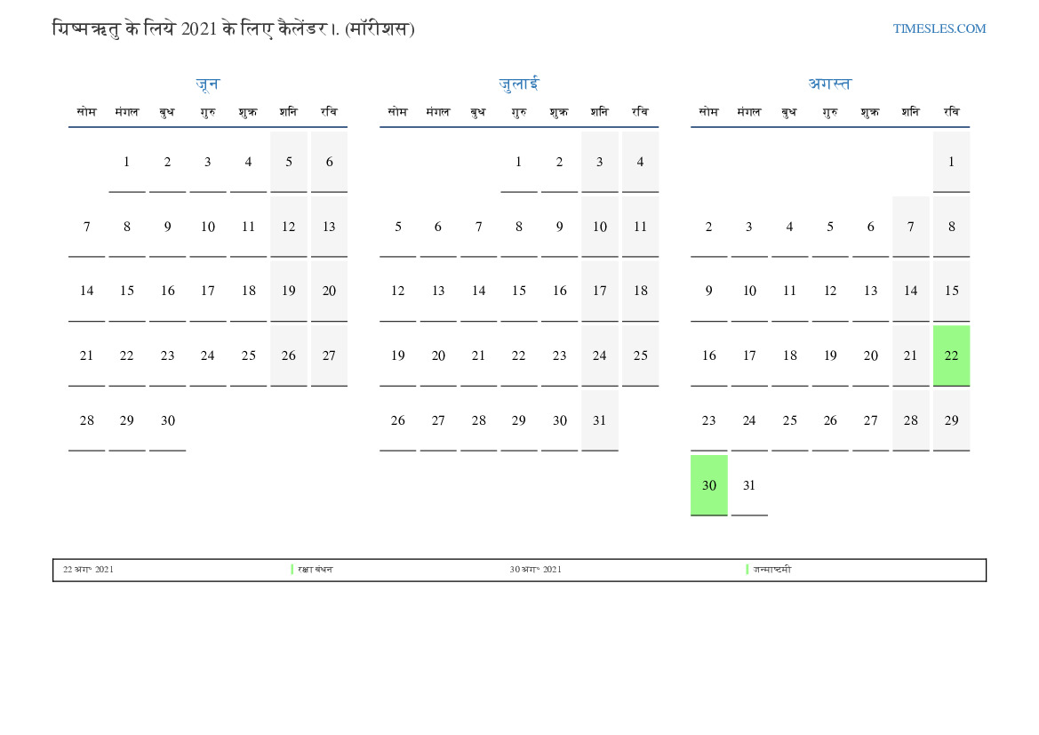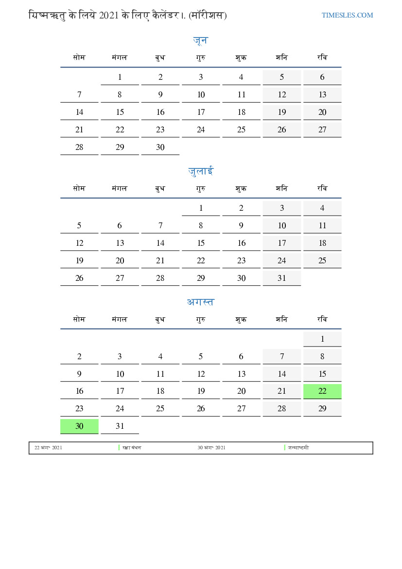 ग्रिष्मऋतु के लिये कैलेंडर 2021 मॉरीशस के लिए