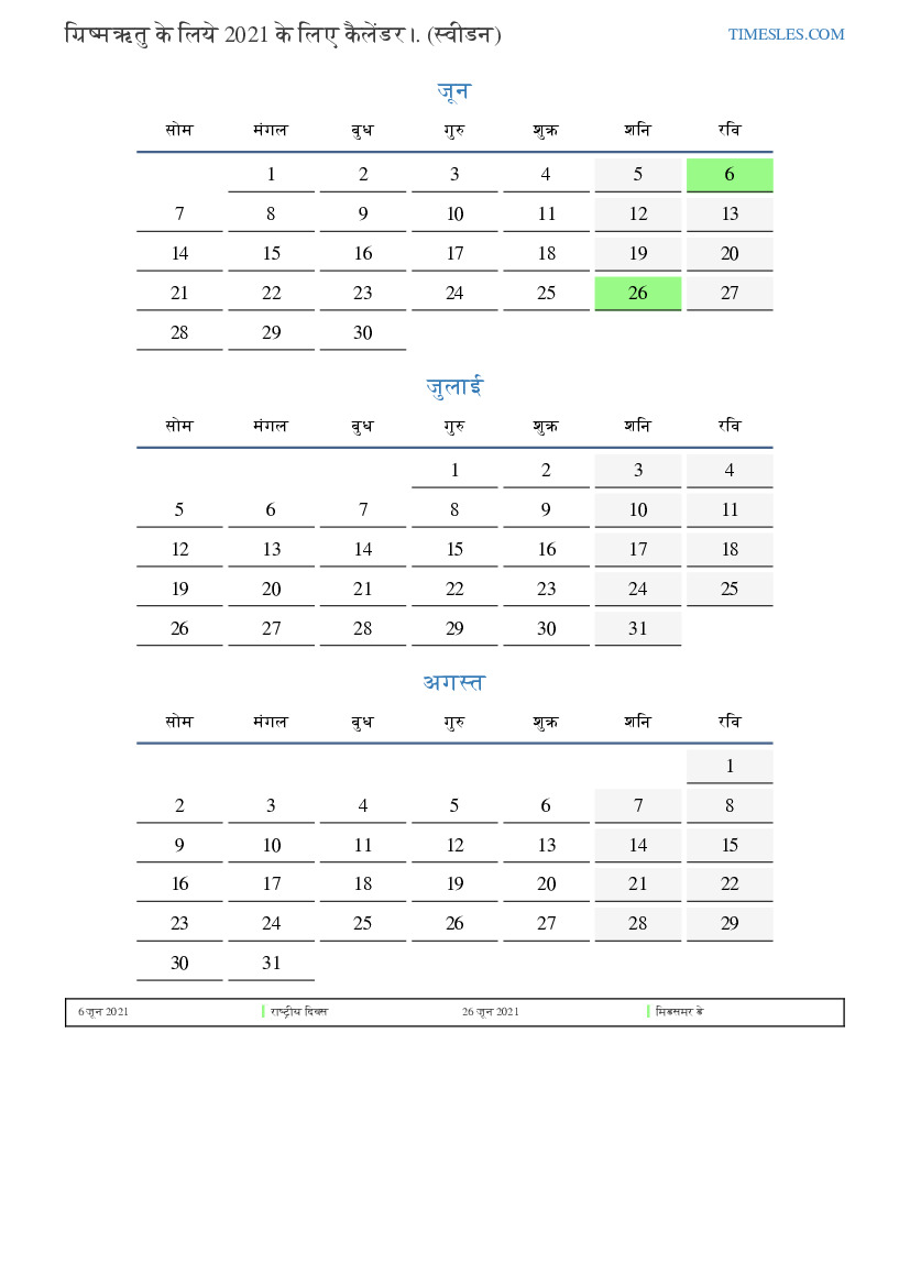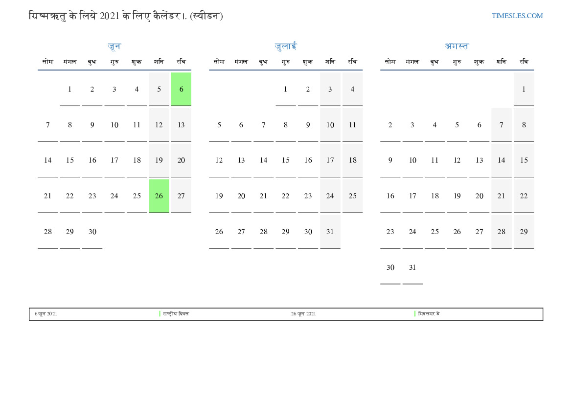 ग्रिष्मऋतु के लिये कैलेंडर 2021 स्वीडन के लिए
