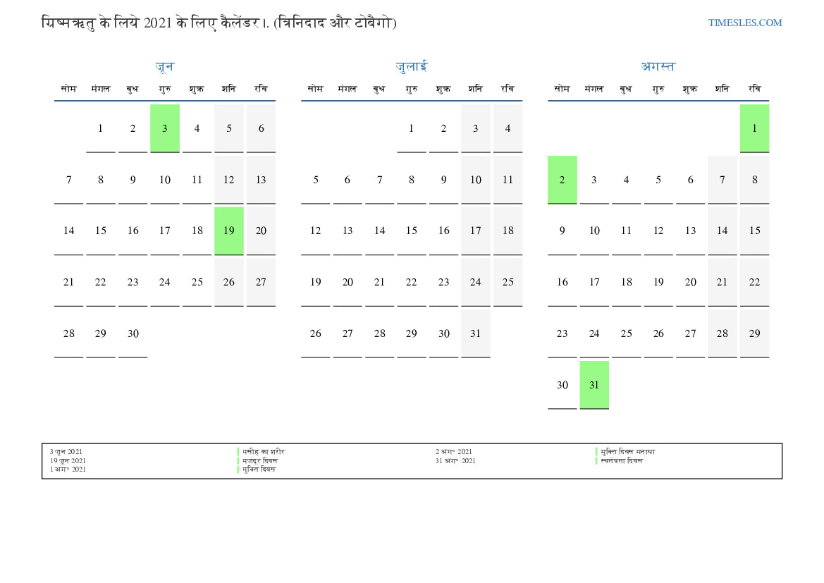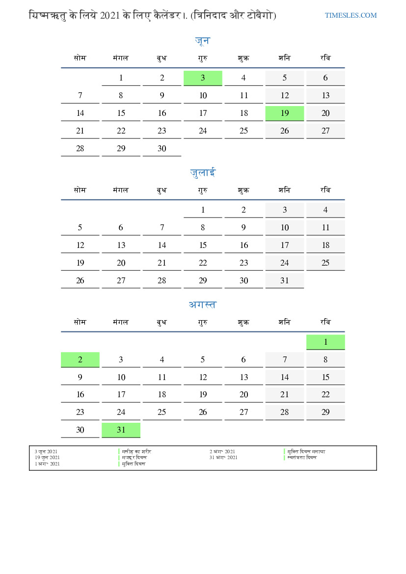 त्रिनिदाद और टोबैगो के लिए 2021 की ग्रिष्मऋतु के लिये छुट्टियों और सप्ताहांत के साथ पीडीएफ कैलेंडर डाउनलोड और प्रिंट करें