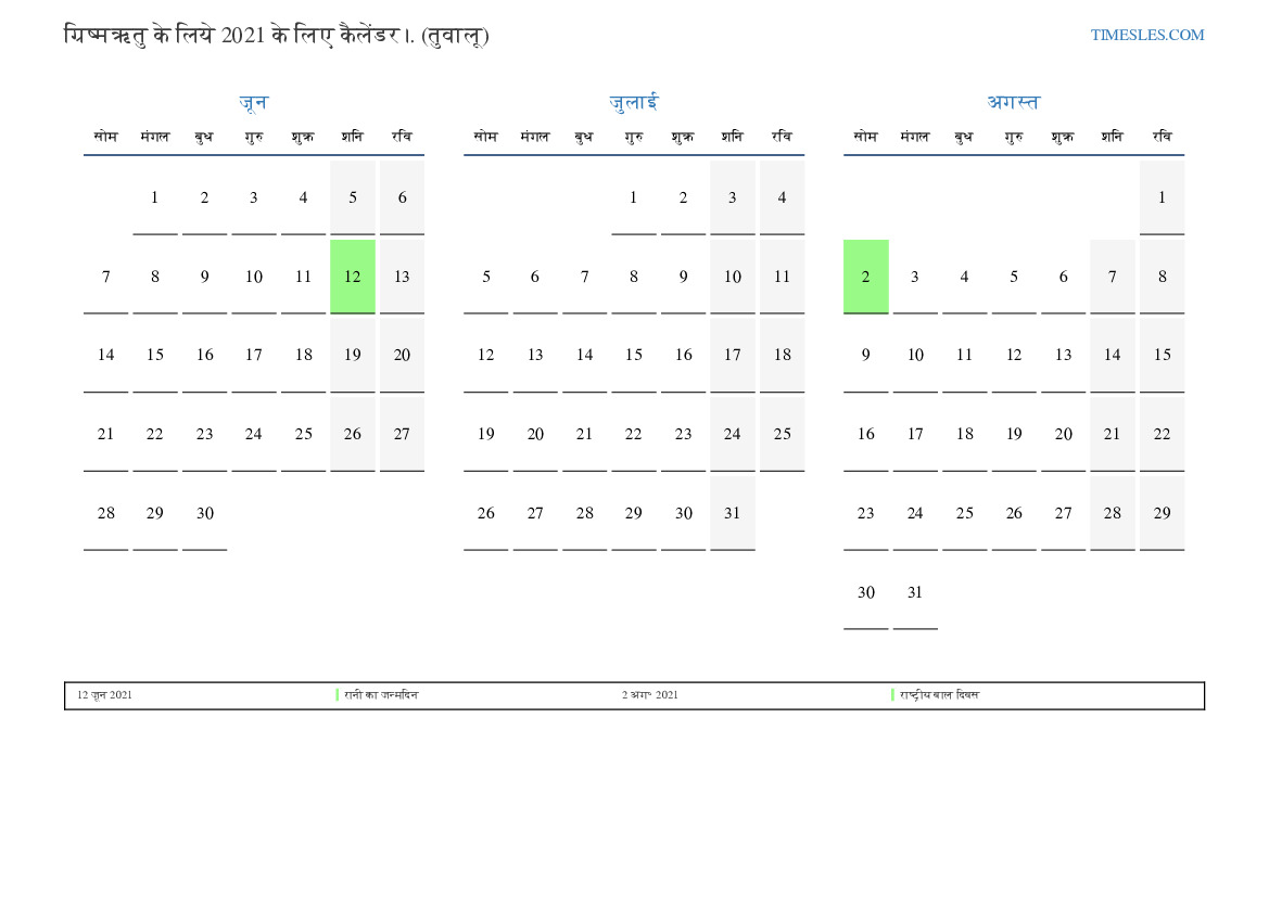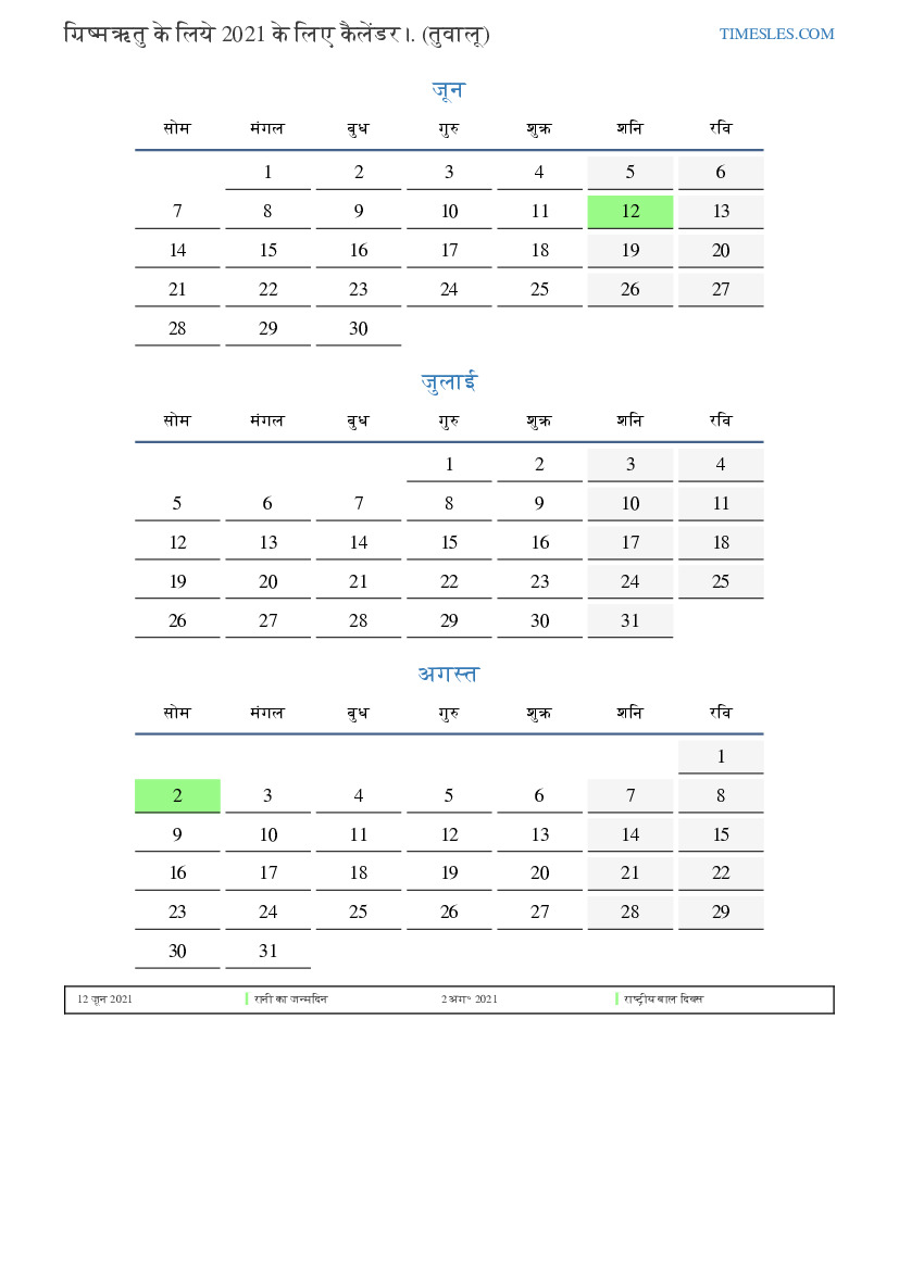 तुवालु के लिए 2021 की ग्रिष्मऋतु के लिये छुट्टियों और सप्ताहांत के साथ पीडीएफ कैलेंडर डाउनलोड और प्रिंट करें