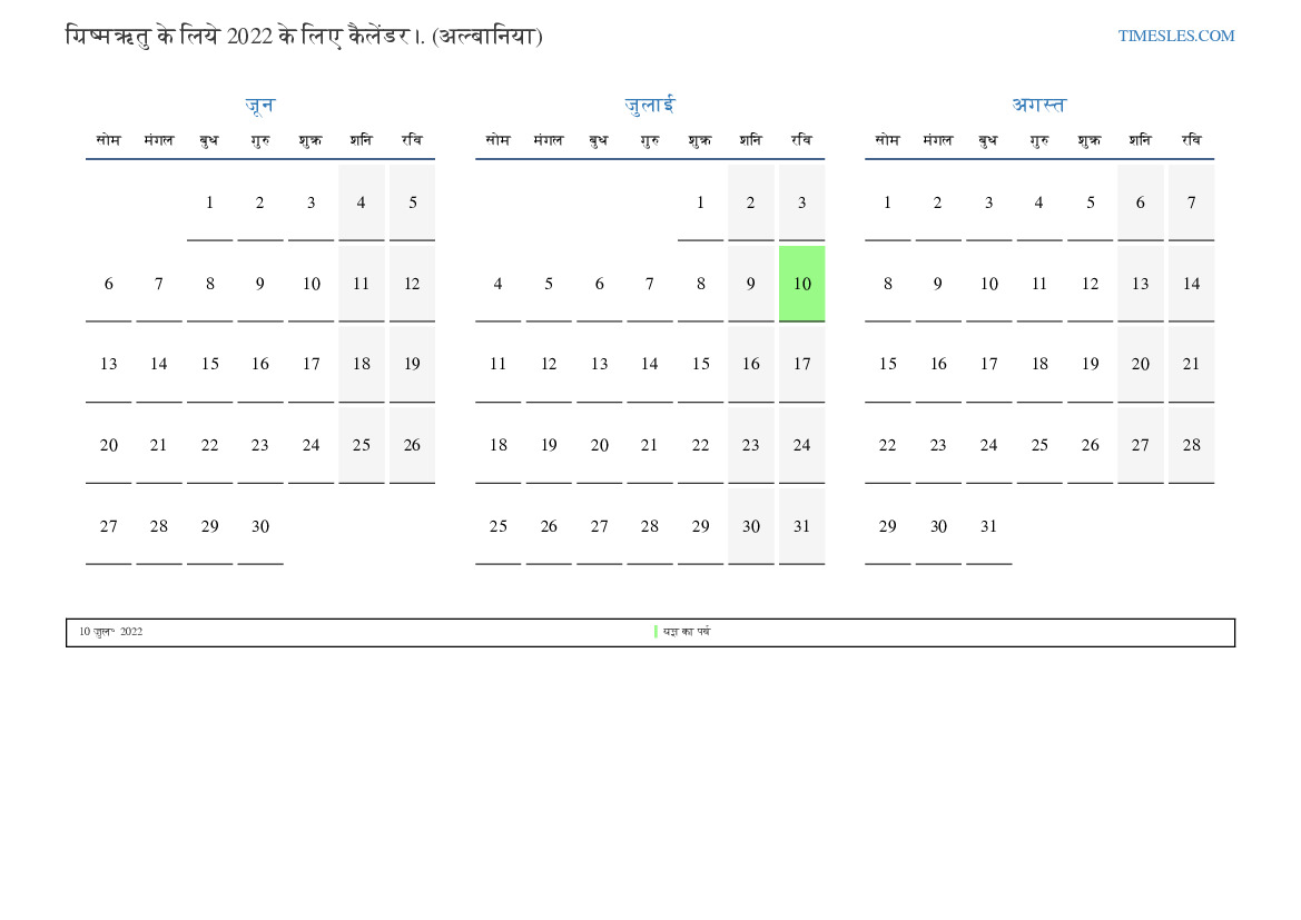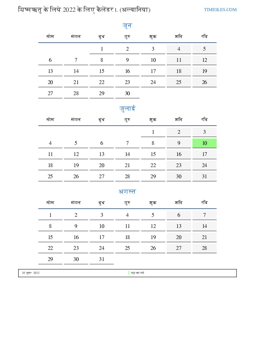 ग्रिष्मऋतु के लिये कैलेंडर 2022 अल्बानिया के लिए