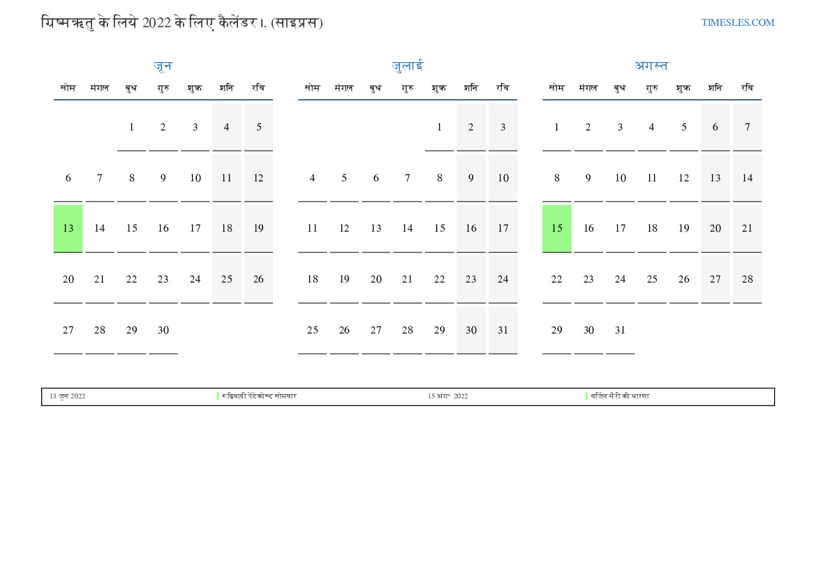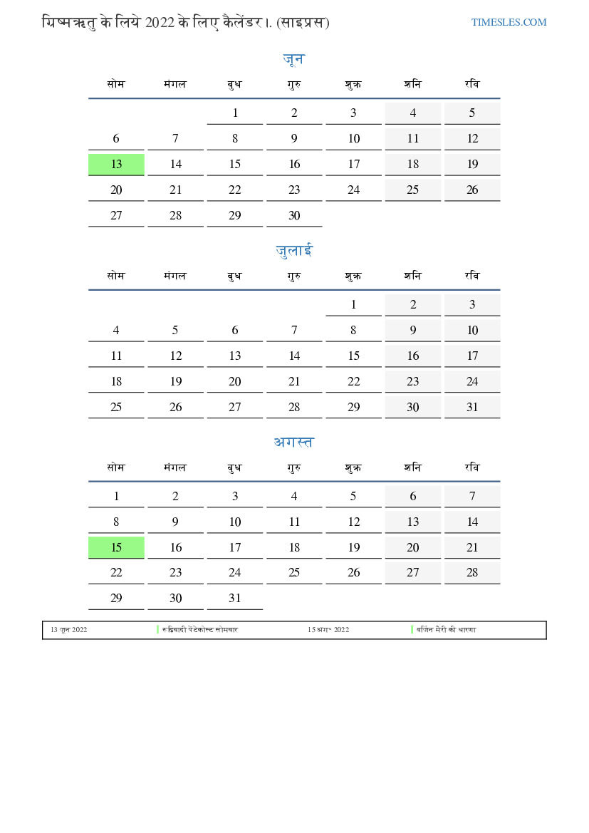 ग्रिष्मऋतु के लिये कैलेंडर 2022 साइप्रस के लिए