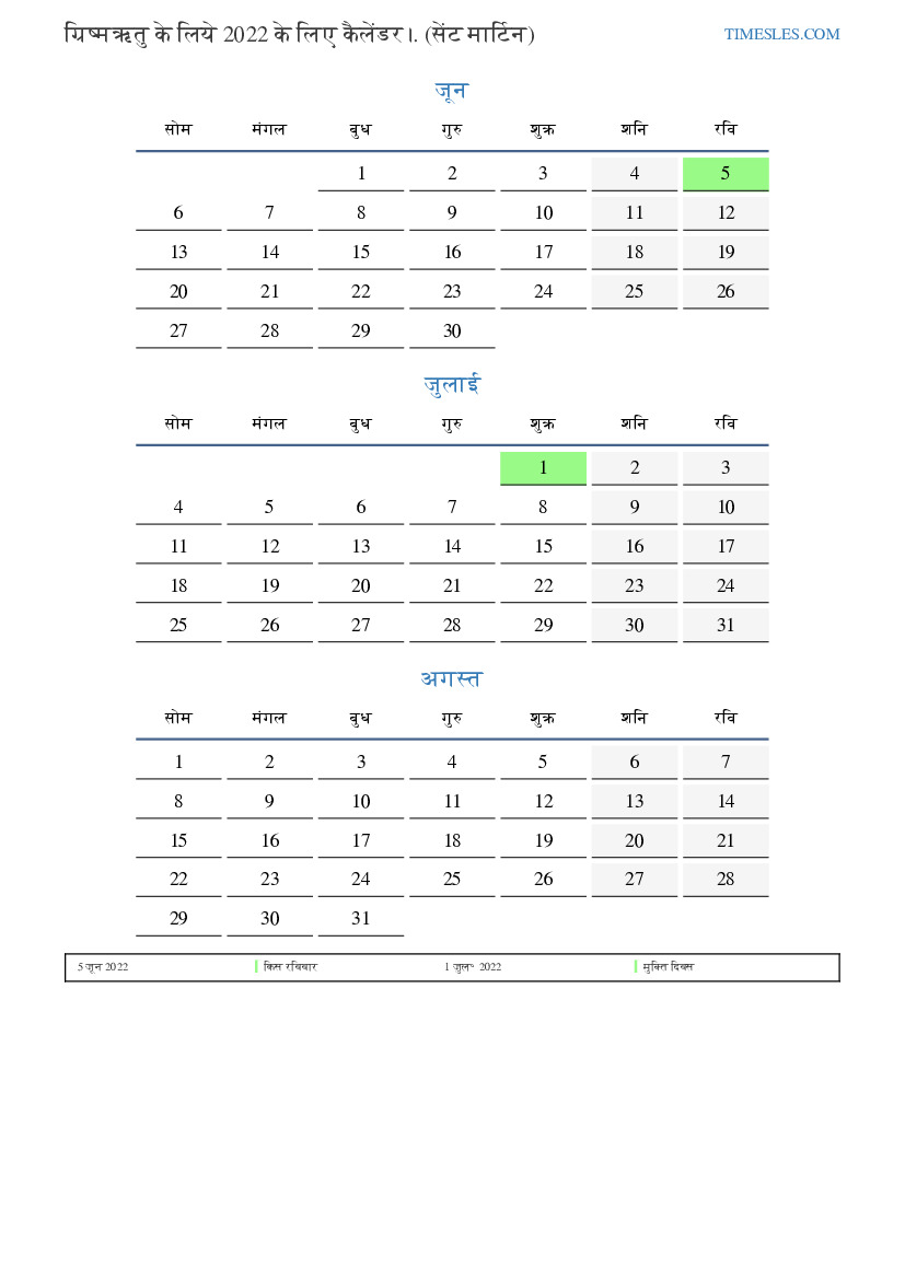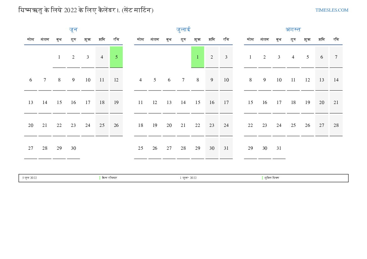 ग्रिष्मऋतु के लिये कैलेंडर 2022 सिंट मार्टेन के लिए
