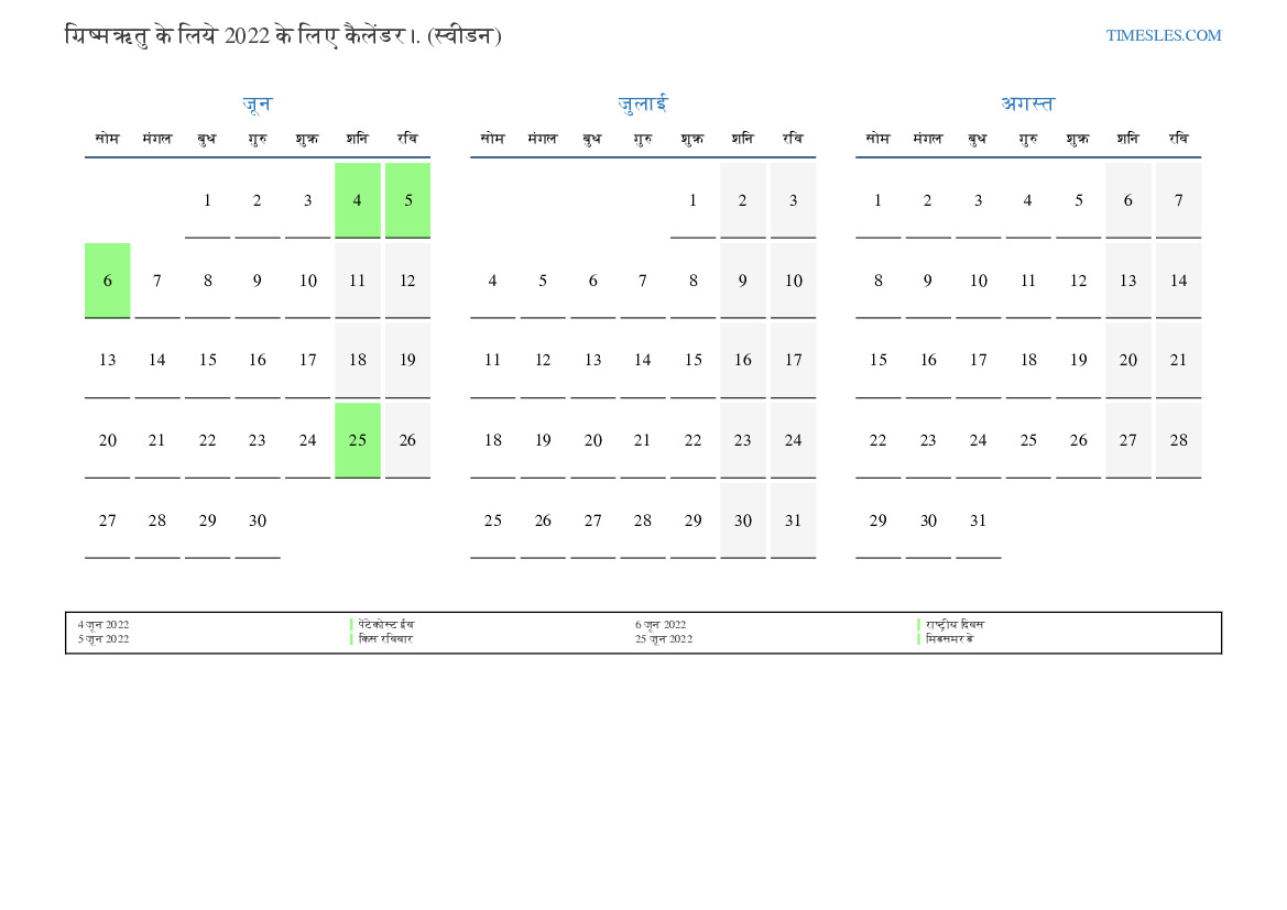 ग्रिष्मऋतु के लिये कैलेंडर 2022 स्वीडन के लिए