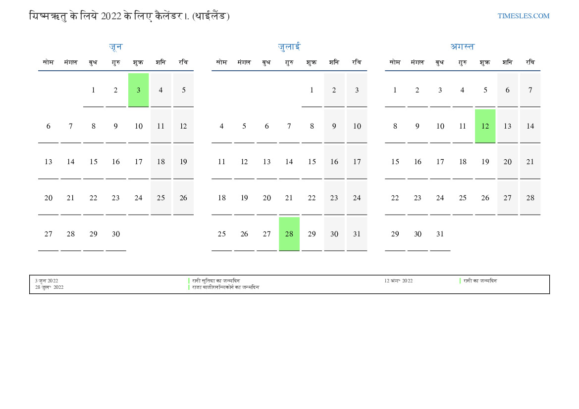 ग्रिष्मऋतु के लिये कैलेंडर 2022 थाईलैंड के लिए