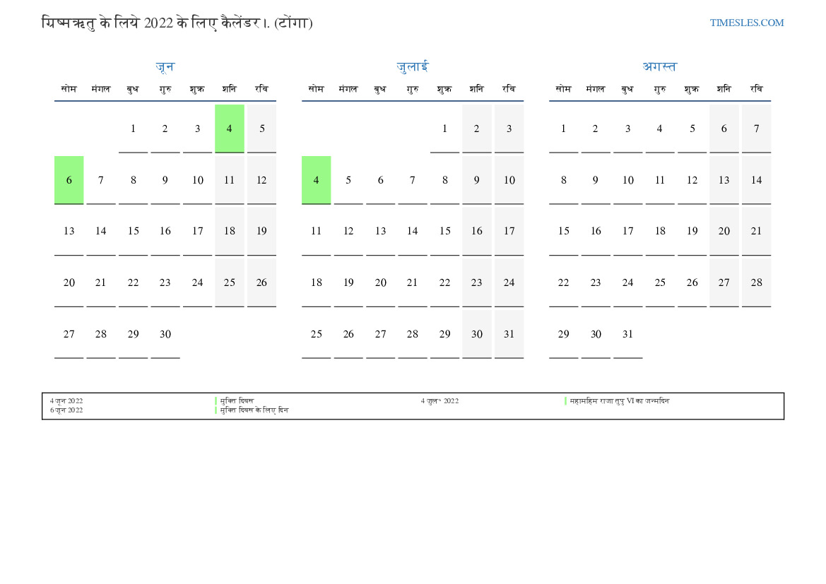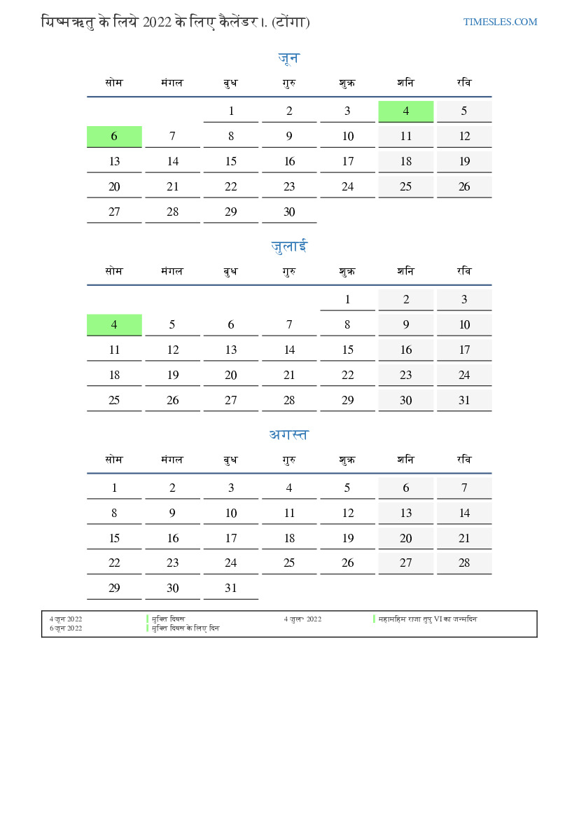 टोंगा के लिए 2022 की ग्रिष्मऋतु के लिये छुट्टियों और सप्ताहांत के साथ पीडीएफ कैलेंडर डाउनलोड और प्रिंट करें