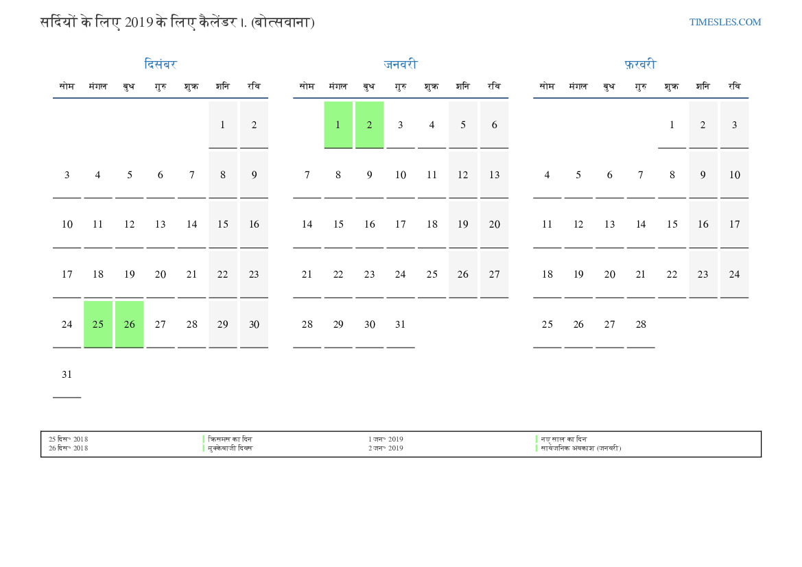 सर्दियों के लिए कैलेंडर 2019 बोत्सवाना के लिए