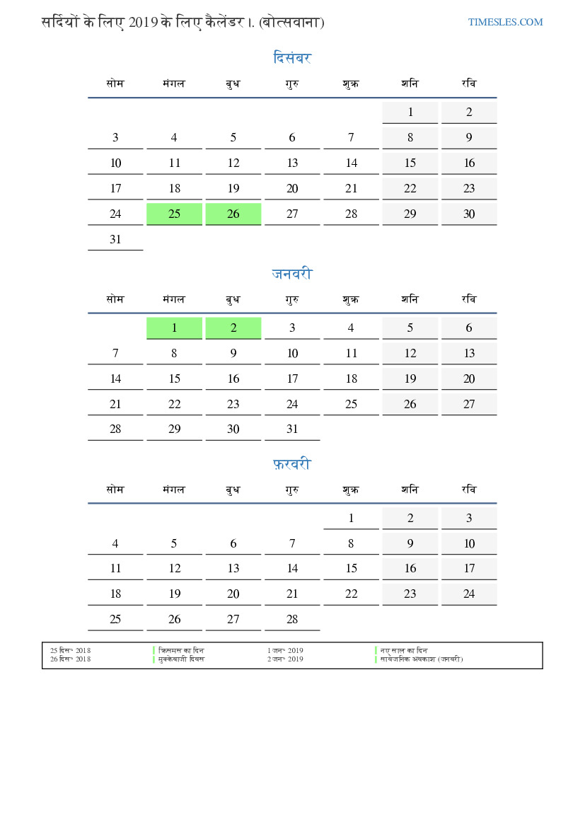 बोत्सवाना के लिए 2019 की सर्दियों के लिए छुट्टियों और सप्ताहांत के साथ पीडीएफ कैलेंडर डाउनलोड और प्रिंट करें