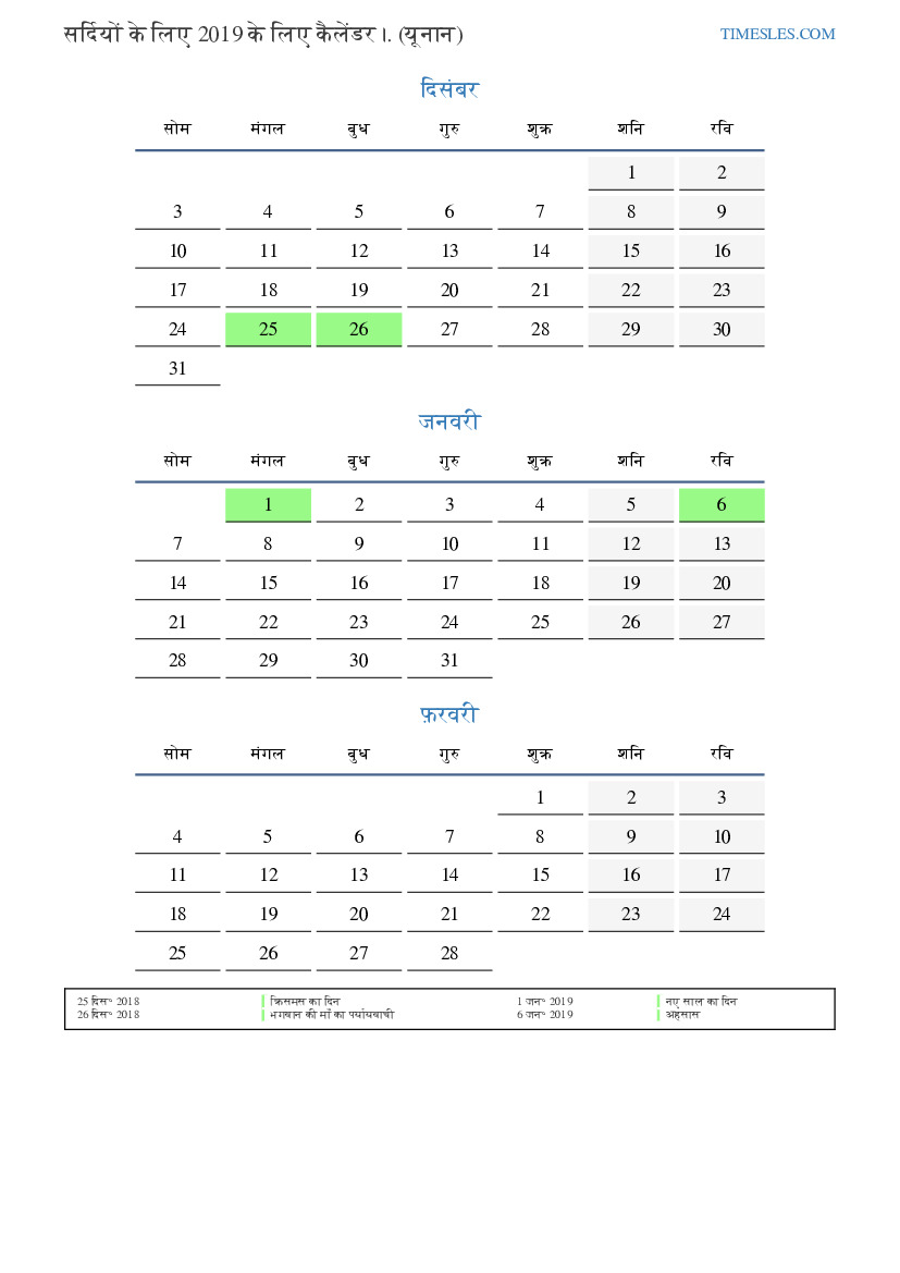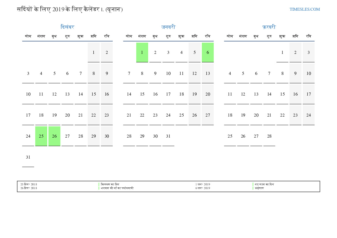 सर्दियों के लिए कैलेंडर 2019 ग्रीस के लिए