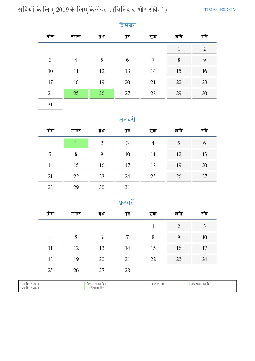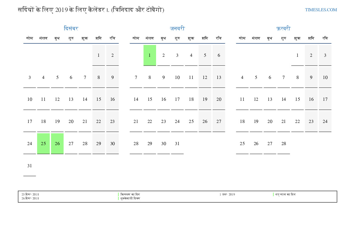 त्रिनिदाद और टोबैगो के लिए 2019 की सर्दियों के लिए छुट्टियों और सप्ताहांत के साथ पीडीएफ कैलेंडर डाउनलोड और प्रिंट करें