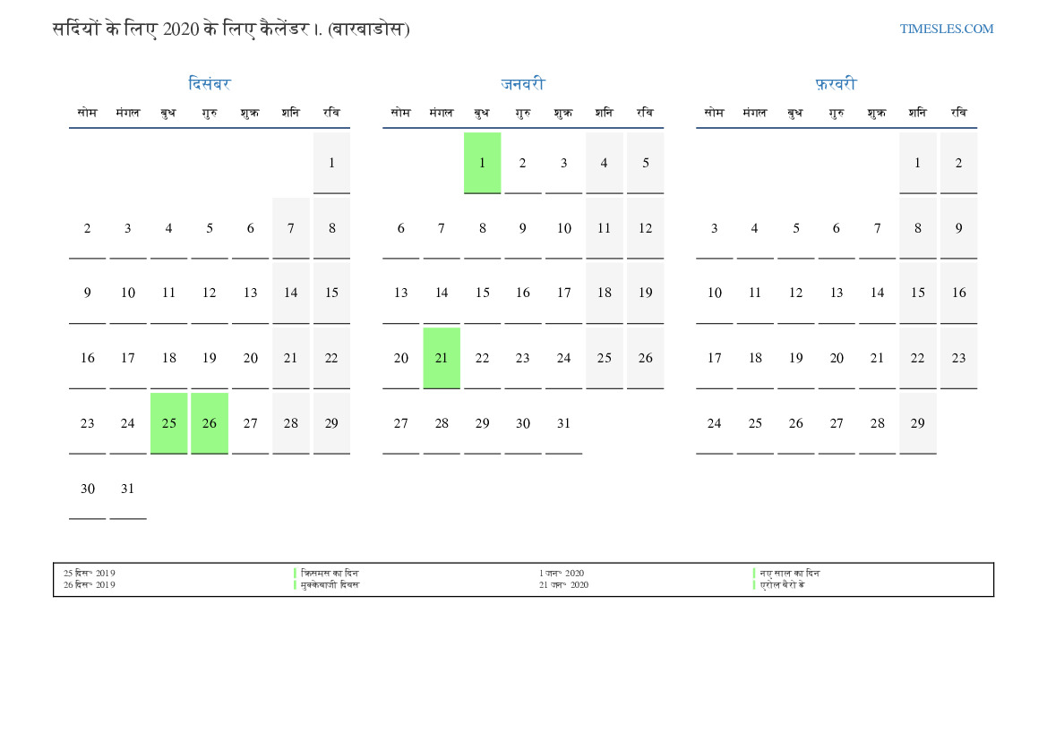 सर्दियों के लिए कैलेंडर 2020 बारबाडोस के लिए