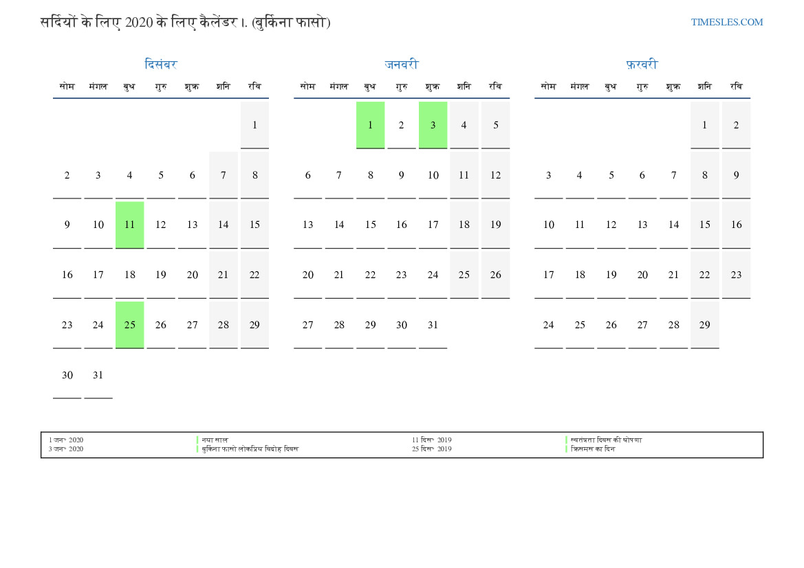 सर्दियों के लिए कैलेंडर 2020 बुर्किना फासो के लिए