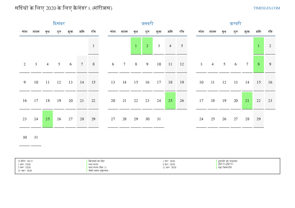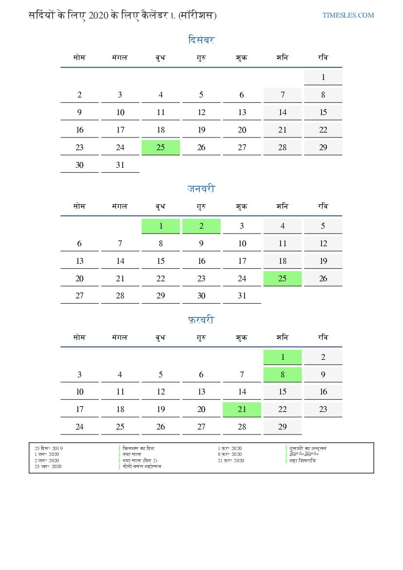 मॉरीशस के लिए 2020 की सर्दियों के लिए छुट्टियों और सप्ताहांत के साथ पीडीएफ कैलेंडर डाउनलोड और प्रिंट करें